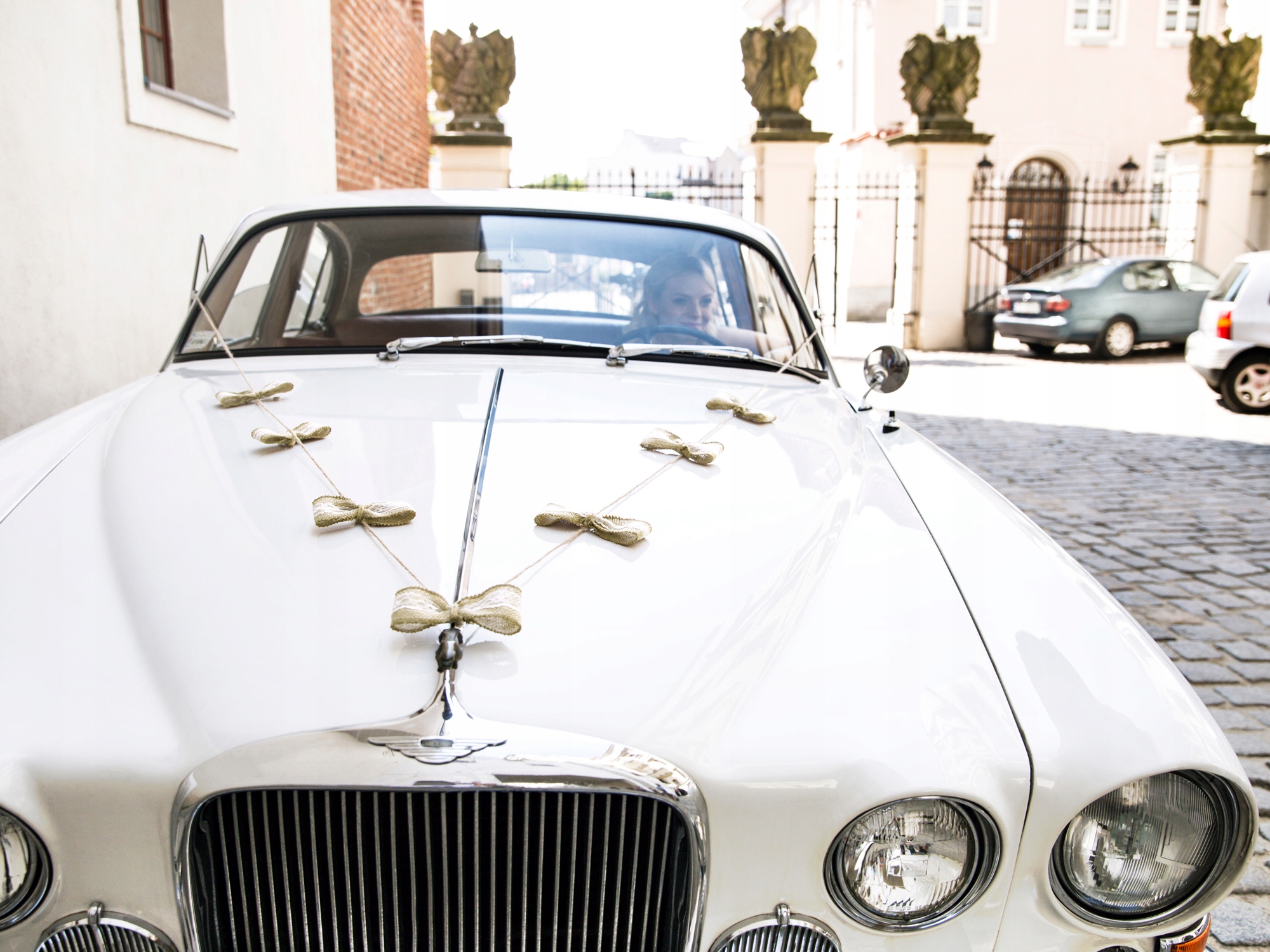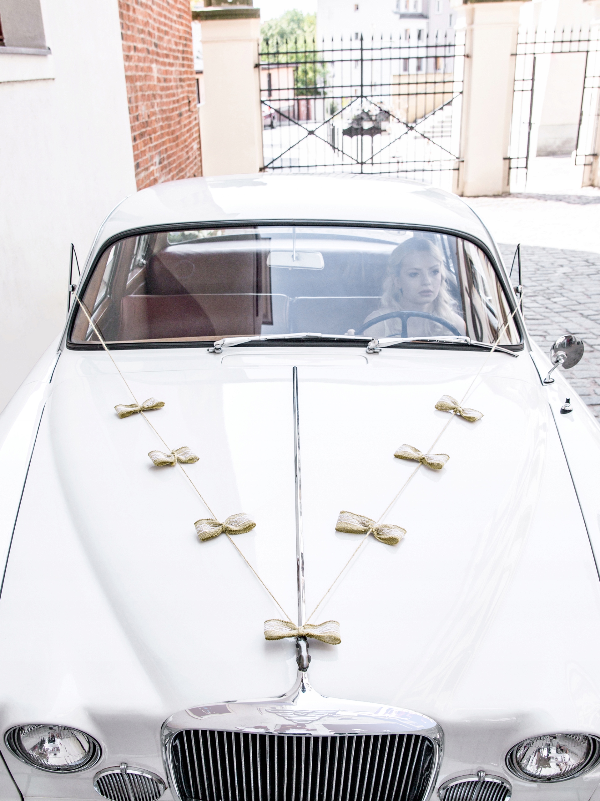 - гирлянда из 7 джутовых бантов с кружевом (ширина ок. 15 см) и джутовой веревкой , бантики завязаны на веревочке, чтобы их можно было свободно перемещать и менять промежутки между ними, чтобы гирлянда подошла к конкретному автомобилю (длина около 6 м)