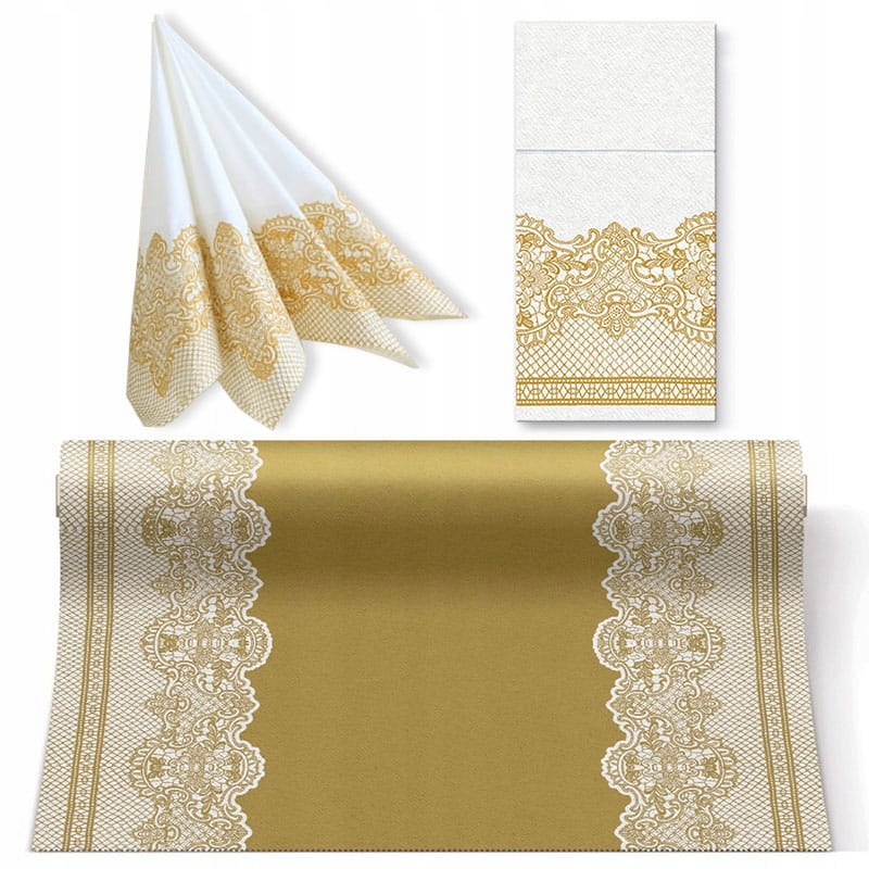 - Набор для украшения стола состоит из дорожки, кармашков для столовых приборов и салфеток. Набор позволит вам просто и очень быстро создать элегантную сервировку стола. Весь комплект украшен красивым кружевом золотого цвета.