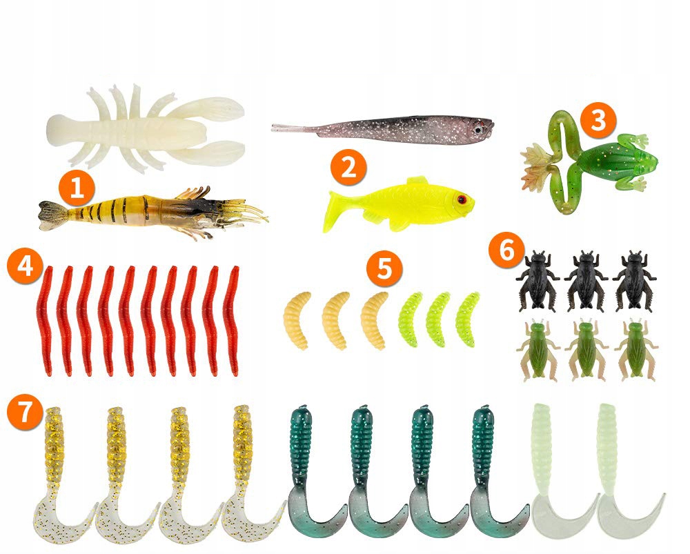 Набор рыболовных приманок: Набор рыболовных приманок с коробкой для снастей включает в себя почти все аксессуары, в том числе: подбрыкники 1шт, VIB 1шт, верхневодные приманки 1шт, черви пластиковые 33шт, мормышка 5шт, мягкая приманка в форме рыбки 2шт, имитация креветки 2шт. Остальные 32 аксессуара также реалистичны и хорошо плавают. Широкий ассортимент рыболовных аксессуаров, от обычных рыболовных приманок до аксессуаров, этот набор рыболовных приманок может стать полным ассортиментом для любого рыболова в любое время года и в любой воде.