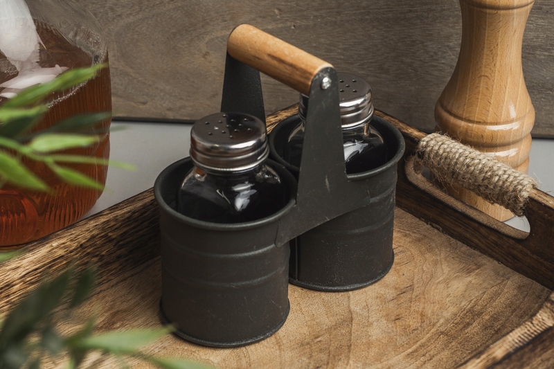Набор из двух стаканов для соли и перца (высота - 9 см). Практичный и стильный, оснащен оригинальной металлической подставкой с деревянной ручкой. Идеальный набор в качестве декоративного элемента для вашей кухни.