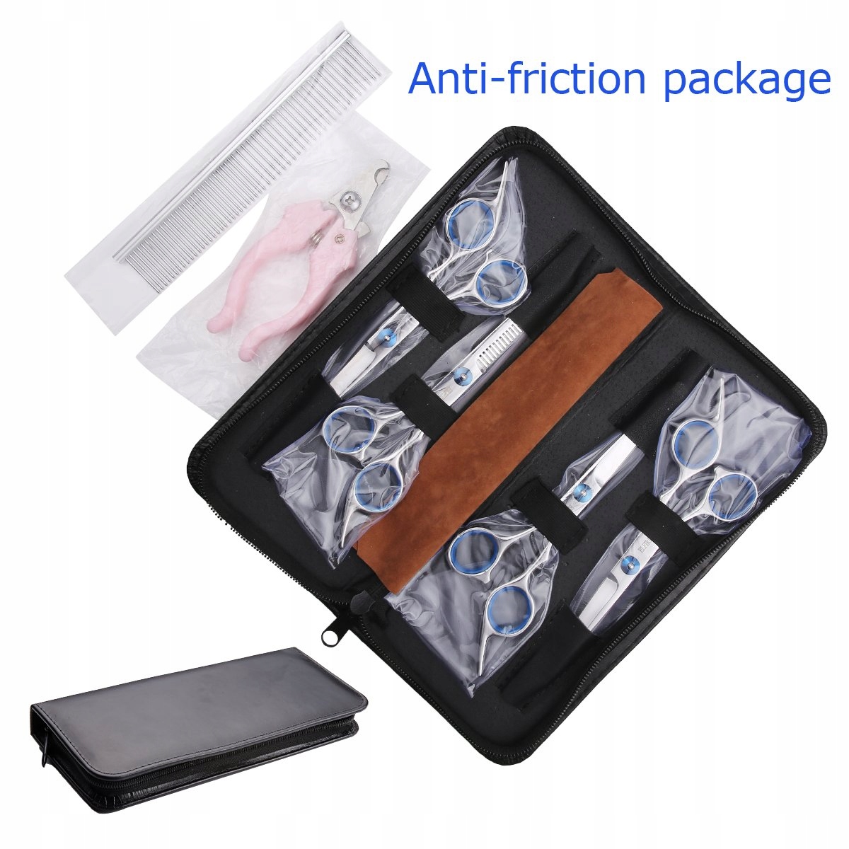 Полный набор для ухода за собакой — в комплект входят 1 прямые ножницы, 1 филировочные ножницы, 1 загнутые вверх ножницы, 1 загнутые вниз ножницы, 1 расческа для стрижки, 1 когтерезка, 1 чистящая салфетка и 1 черный кожаный чехол.