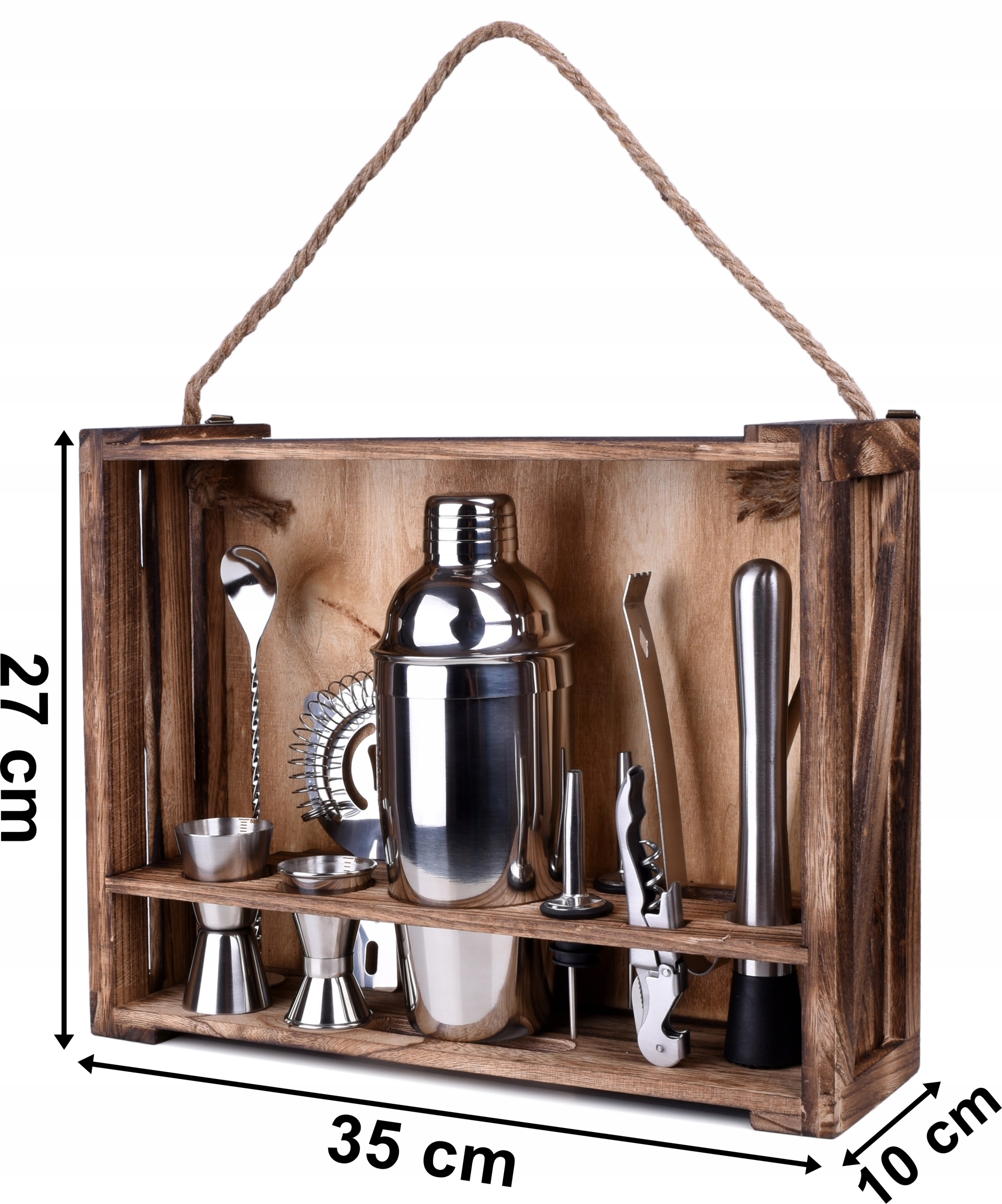 Вы устраиваете вечеринку и хотите удивить своих гостей? Набор бармена поможет начать вечеринку и приготовить оригинальные, интересные напитки. Каждый элемент набора изготовлен из нержавеющей стали высочайшего качества. >, благодаря чему не меняет вкус напитков. В комплект входят 11 элементов: 10 аксессуаров из нержавеющей стали и подставка из карбонизированной сосны.
