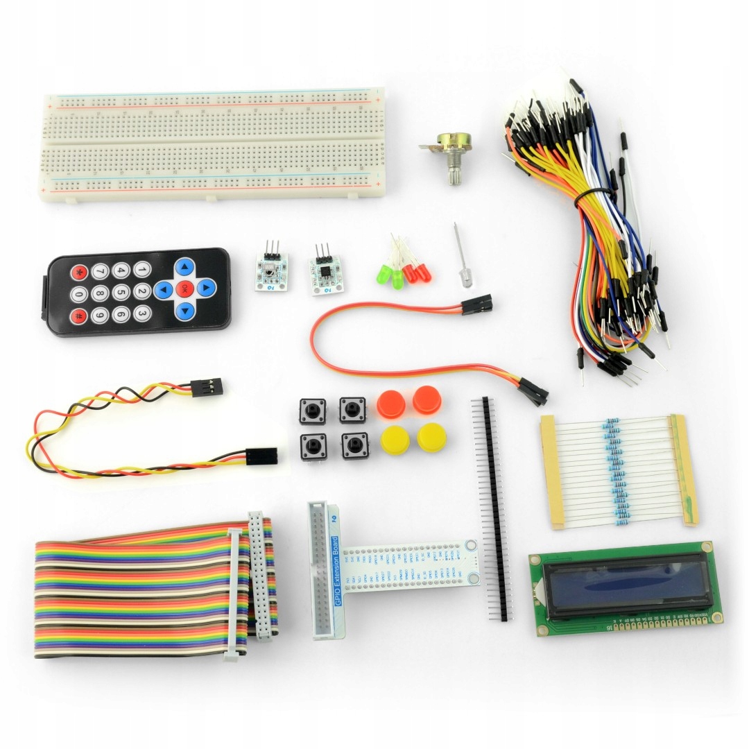 Набор элементов-прототипов миникомпьютера Raspberry Pi в версиях 4B, 3B+, 3B, 2B, Zero и Zero W. В комплект входят: макетная плата, ЖК-дисплей, светодиоды, ИК-приемник, пульт дистанционного управления, датчик температуры, резисторы и многие другие.