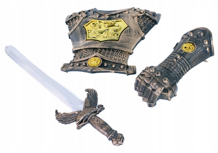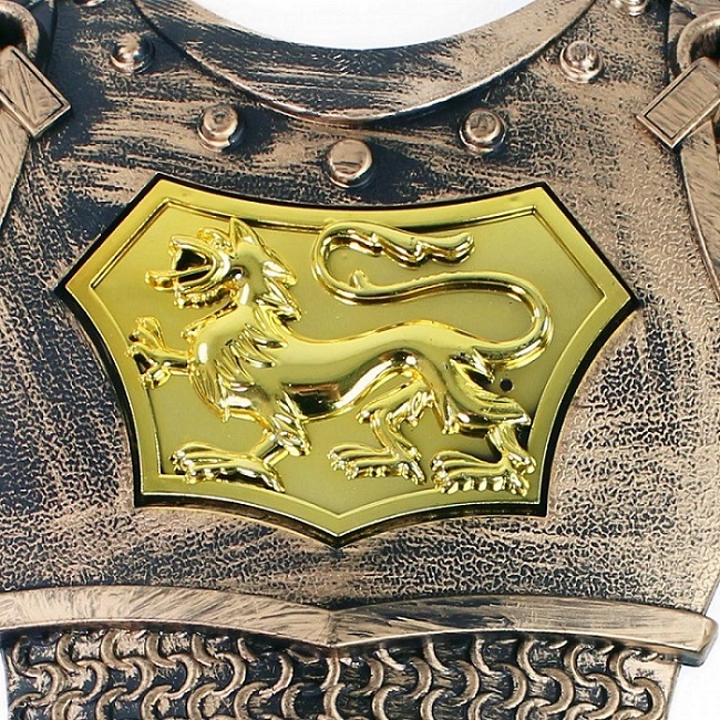 Отважный и отважный рыцарь готов веселиться вместе! Рыцарские аксессуары станут прекрасным дополнением костюма каждого маленького участника карнавального бала – в комплект входит фрагмент доспеха, меч и перчатка со сжатым кулаком. Все элементы костюма стилизованы и выглядят так, будто сделаны из меди, отмеченной символикой золотого дракона.