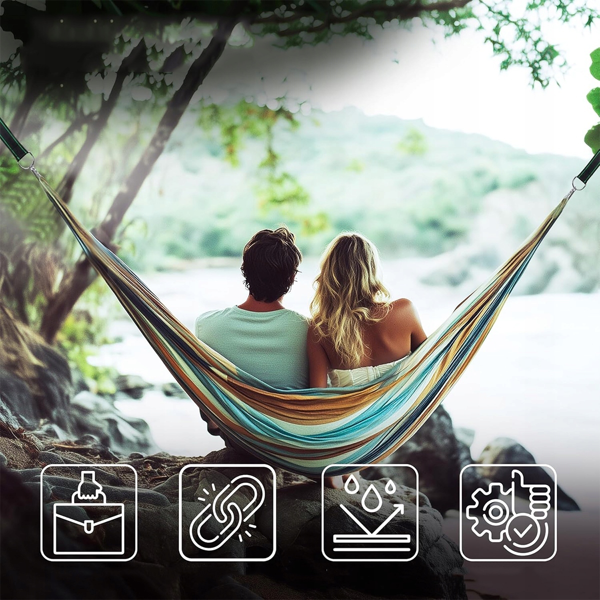 Содержит все необходимое для безопасного крепления; Состоит из 2 лямок гамака длиной 150 см с D-образным кольцом (шириной 5 см), 2 карабинов, 2 фетровых ковриков для защиты деревьев, 2 жестких заплат и 1 сумки для хранения.