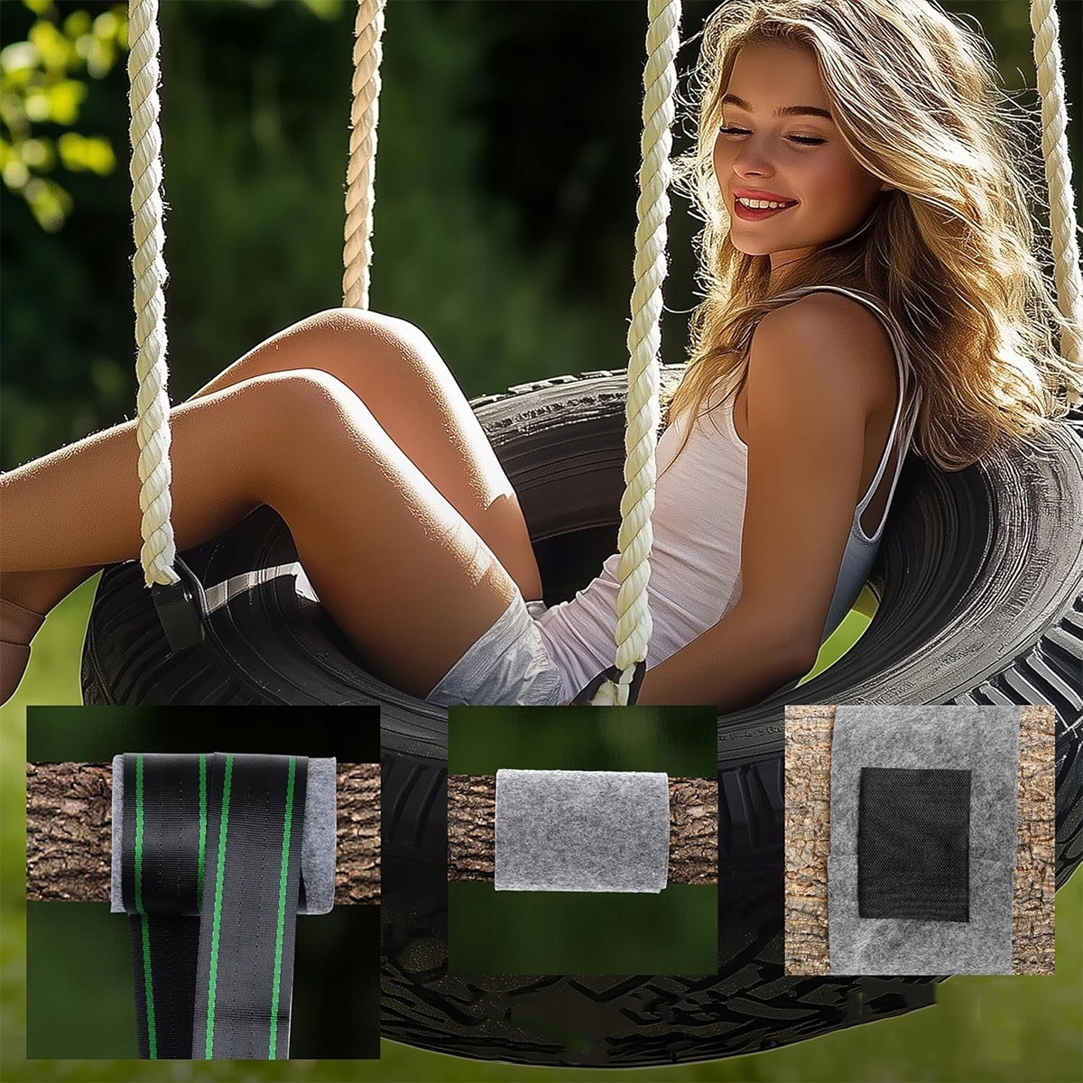 продуманная конструкция, обеспечивающая монтаж с низким коэффициентом трения; Инструкции: обвяжите веревку несколько раз вокруг ствола, проденьте ремень для крепления дерева через петлю, прикрепите карабин к первой петле, повесьте гамак и плотно закрутите карабин.
