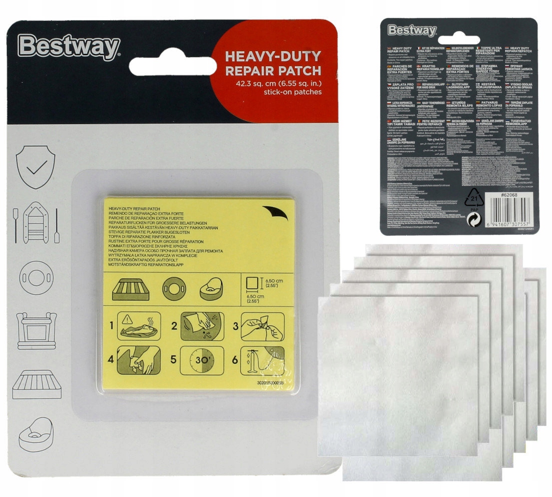 Набор ремонтных резиновых поверхностей будет полезен в каждом доме. В случае повреждения надувной поверхности различных статей вам не нужно сразу писать такой предмет. Для Self -Repair просто ремонтный комплект, представленный в этом предложении, патчи с клейкой на поверхности наклейки. Использование их - это детская игра. Набор упакован в красочный волдырь, предназначен для использования в случае истирания или пирсинга садового бассейна, надувного мяча, матраса или пляжной игрушки . Набор включает в себя 10 больших прозрачных пятен винил с клеем с размерами: 6,5 см х 6,5 см. Необходимый размер патча может быть свободно отрегулирован с использованием нескольких патчей или вырезать ножницами меньший фрагмент . Их предположение - это вопрос до нескольких секунд, и вы можете пользоваться эффективностью надувных аксессуаров.