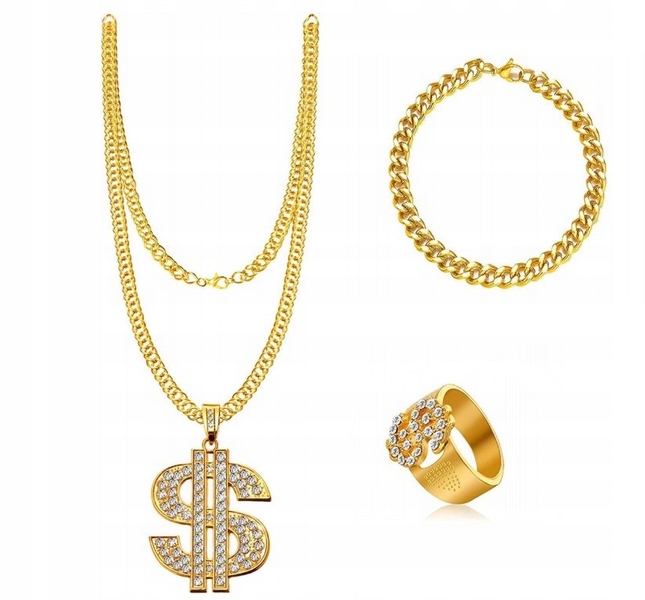 - Цепочка - длина ок. 70 см, дополнен внушительным кулоном в форме доллара (6 х 6 см), украшенным серебристыми камнями, имитирующими блеск драгоценных кристаллов.