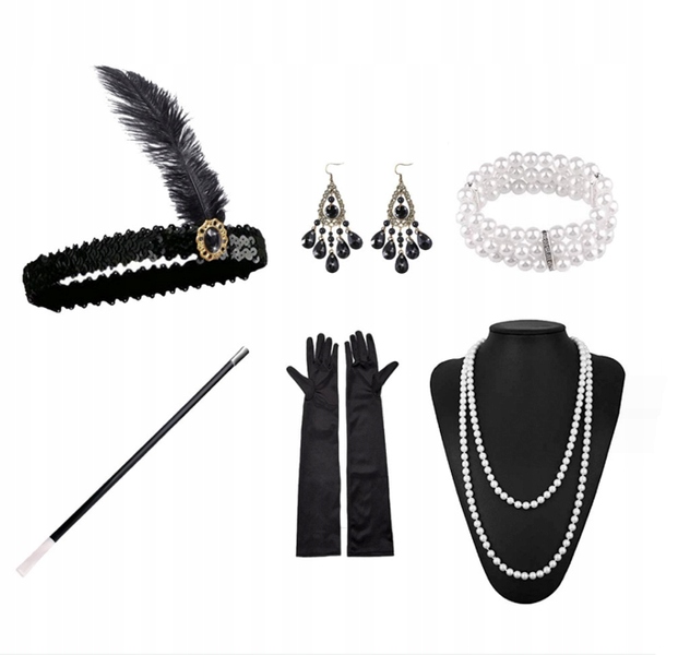 Комплект прекрасно дополнит стиль, вдохновленный 20-ми, 30-ми годами, а также Чарльстоном и Флэппером. Идеально подходит для костюмов в стиле ретро, карнавала или тематической вечеринки.