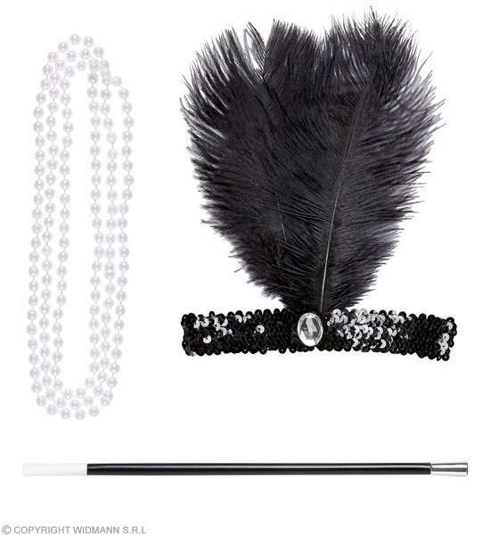 Повязка крепится на резинку и покрыта черными блестящими пайетками. Передняя часть украшена прозрачным кристаллом и двумя эффектными перьями.