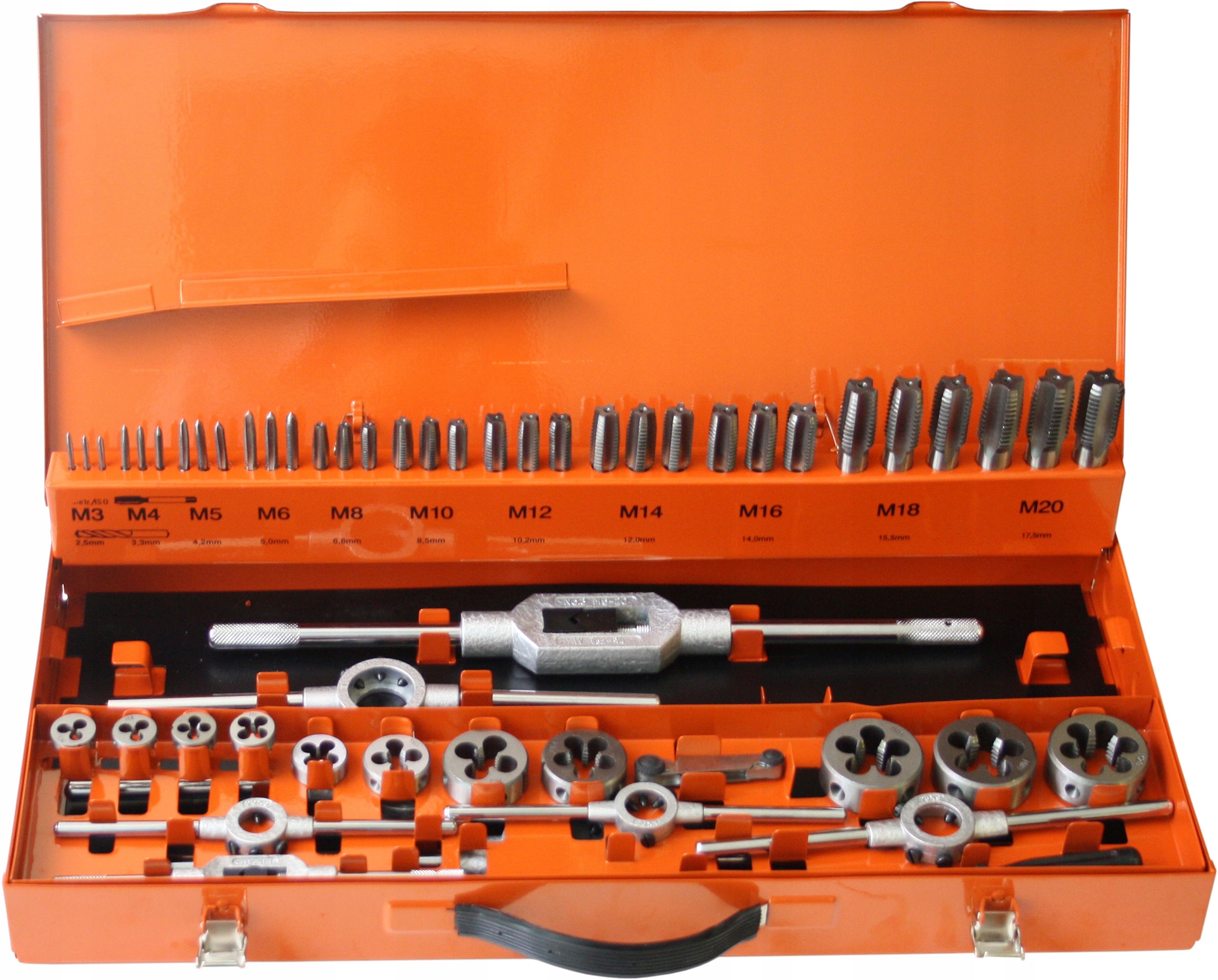Профессиональный набор ниток и эксклюзивный CORONA C9183. Набор включает в себя резьбы, медсестры, ручки резьбов, питательные вещества, нити и отвертка. Инструменты встречаются с DIN 352.