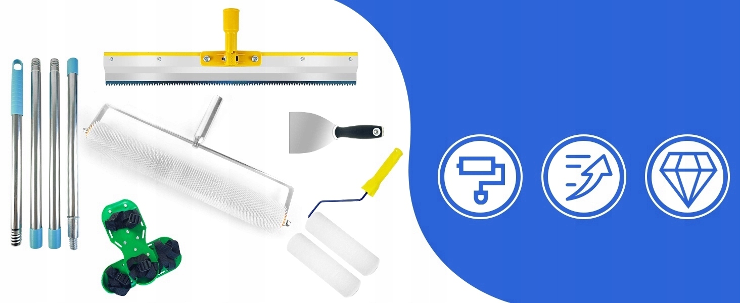 НАБОР ДЛЯ ПОКРЫТИЯ ДЛЯ ПОЛА:набор из 6 предметов. В комплект входят пара башмаков для аэрации газона, ракель длиной 56 см, деаэрационный валик длиной 50 см для удаления пузырьков воздуха с напольных покрытий, телескопическая штанга длиной 42-162 см, два малярных валика длиной 30 см и шпатель длиной 10 см. С помощью этого набора вы сможете создать самовыравнивающуюся конструкцию.