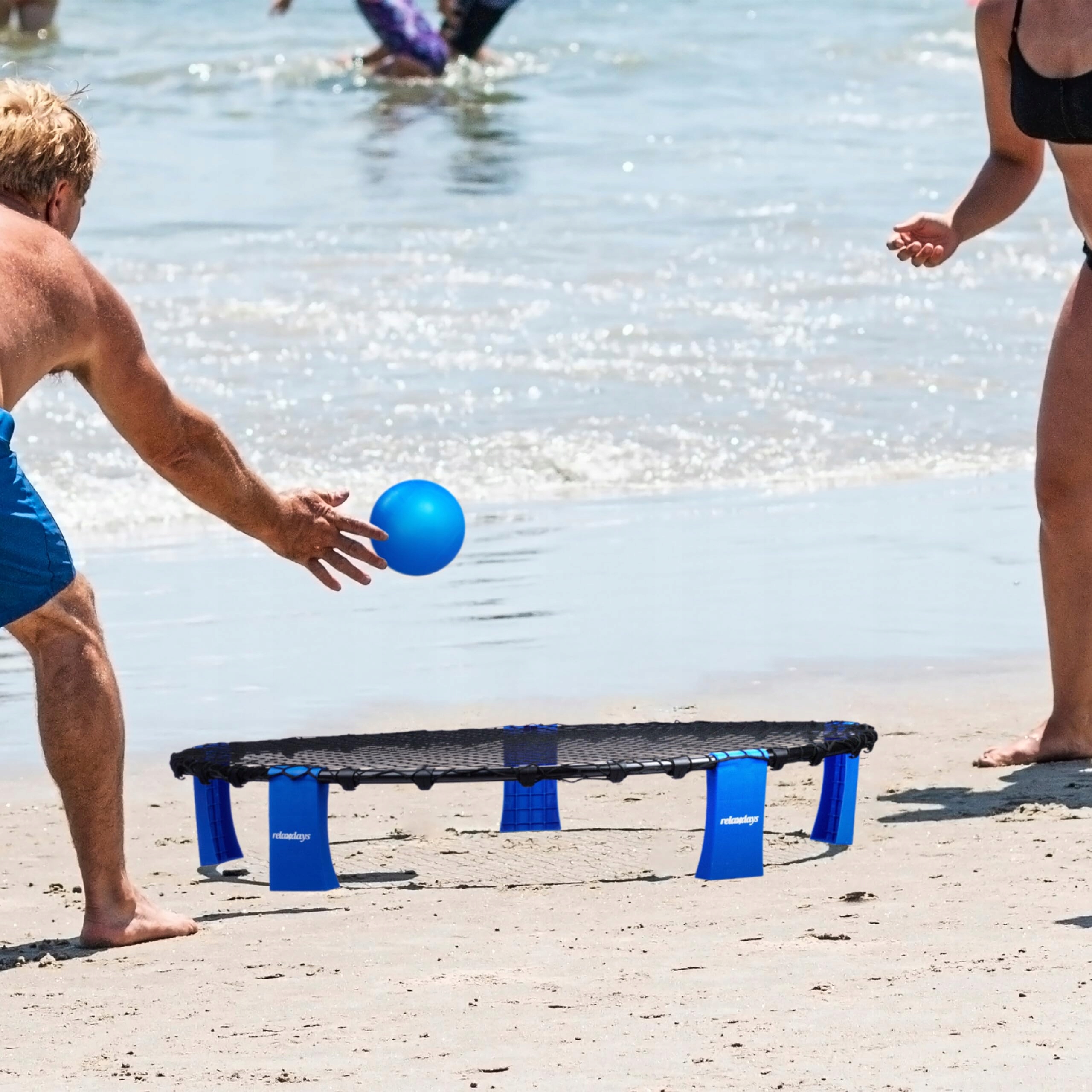 - название типа изделия: комплект Relaxdays Roundnet, сетка, 3 мяча, насос для мячей и сумка для переноски, мяч для улицы, пляж, сад, парк, черный/синий