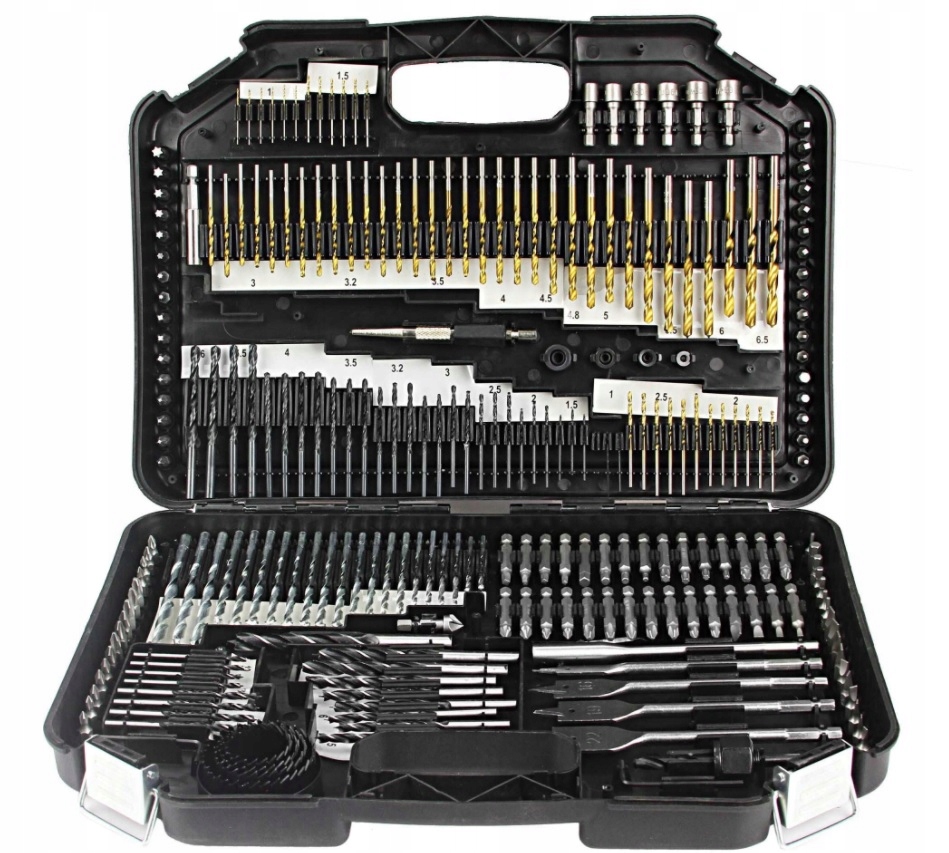 В комплект входят сверла по дереву, сверла по металлу, сверла по бетону, сверла, перьевые сверла, кольцевые пилы, биты, шестигранные головки, зенковка, шестигранный ключ, переходники.