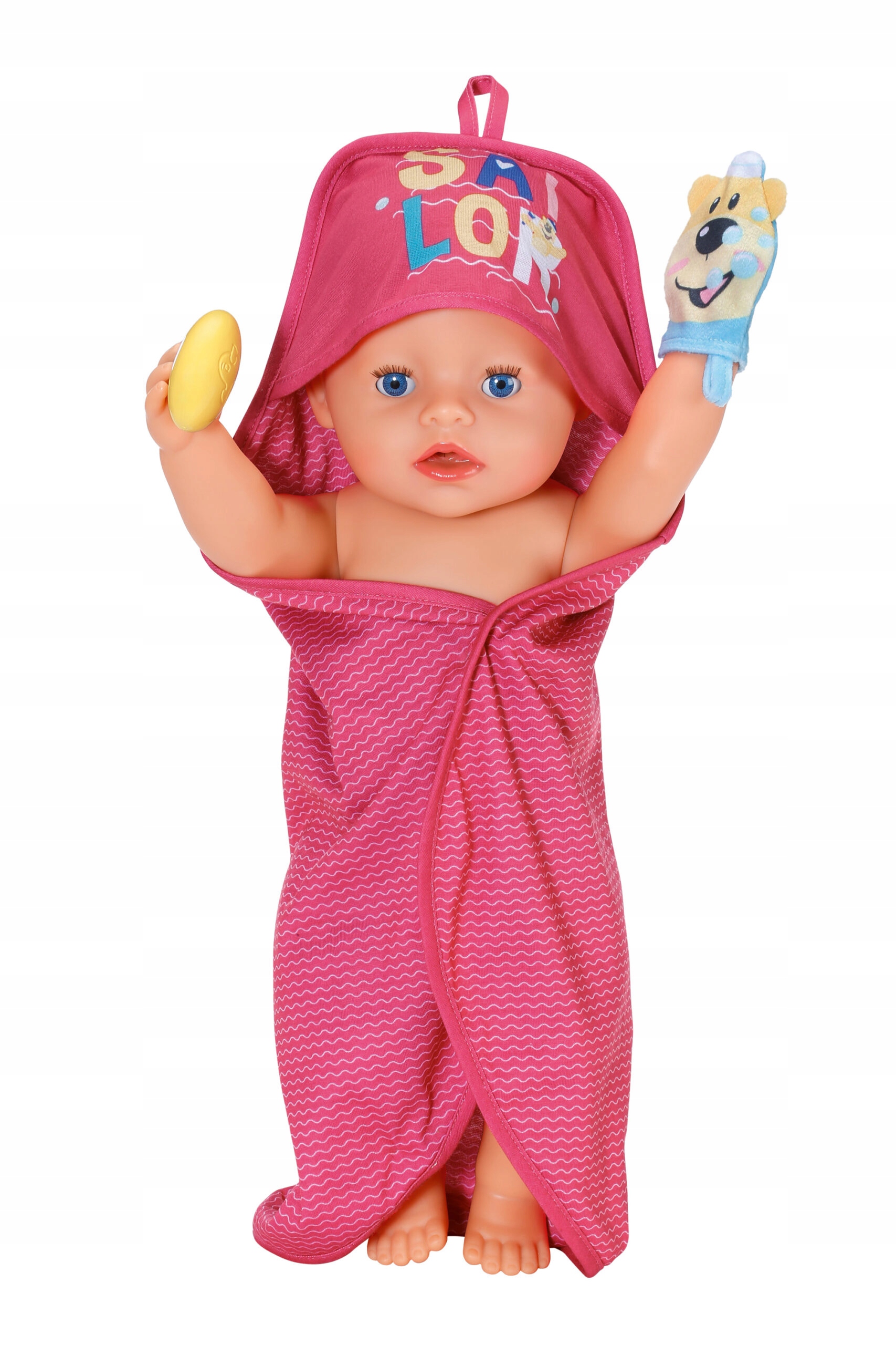 Откройте для себя необычный набор, который обеспечит вашу куклу тепло и комфорт после каждой ванны. Очаровательное полотенце с капюшоном сделано из деликатного материала, идеально обволакивающего вашу куклу. Красочная тема с надписью «Маленький моряк» и веселый медведь придают ему дополнительное очарование.