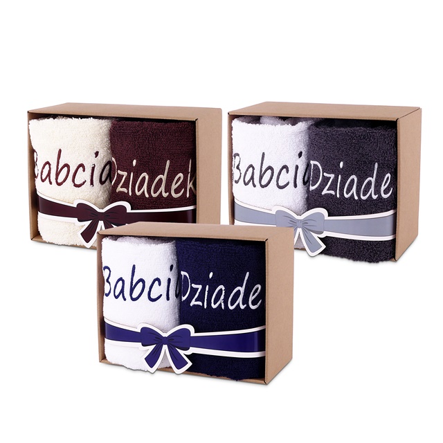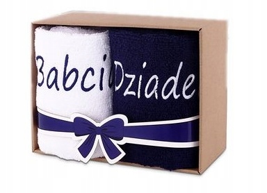 Два мягких хлопковых полотенца с вышивкой - Бабушка/Дедушка в белом и темно-синем цветах б >. Упаковано в картонную коробку, украшенную бумажным бантиком - идеально для подарка!