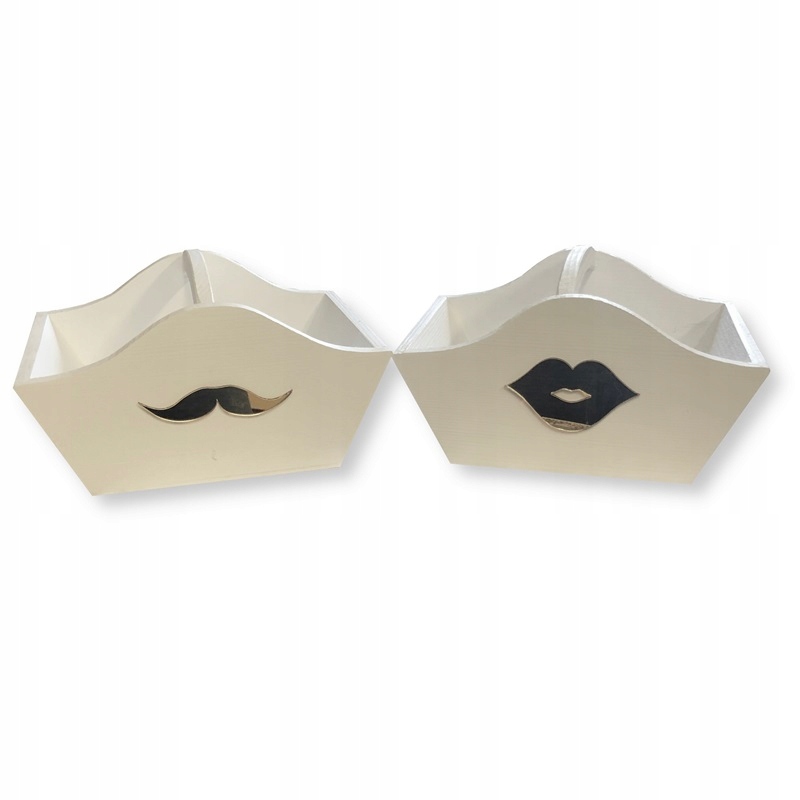 p>Корзины изготовлены из дерева, окрашены в белый цвет, а наклеенная графика усов и губ выполнена из золотого зеркала.
