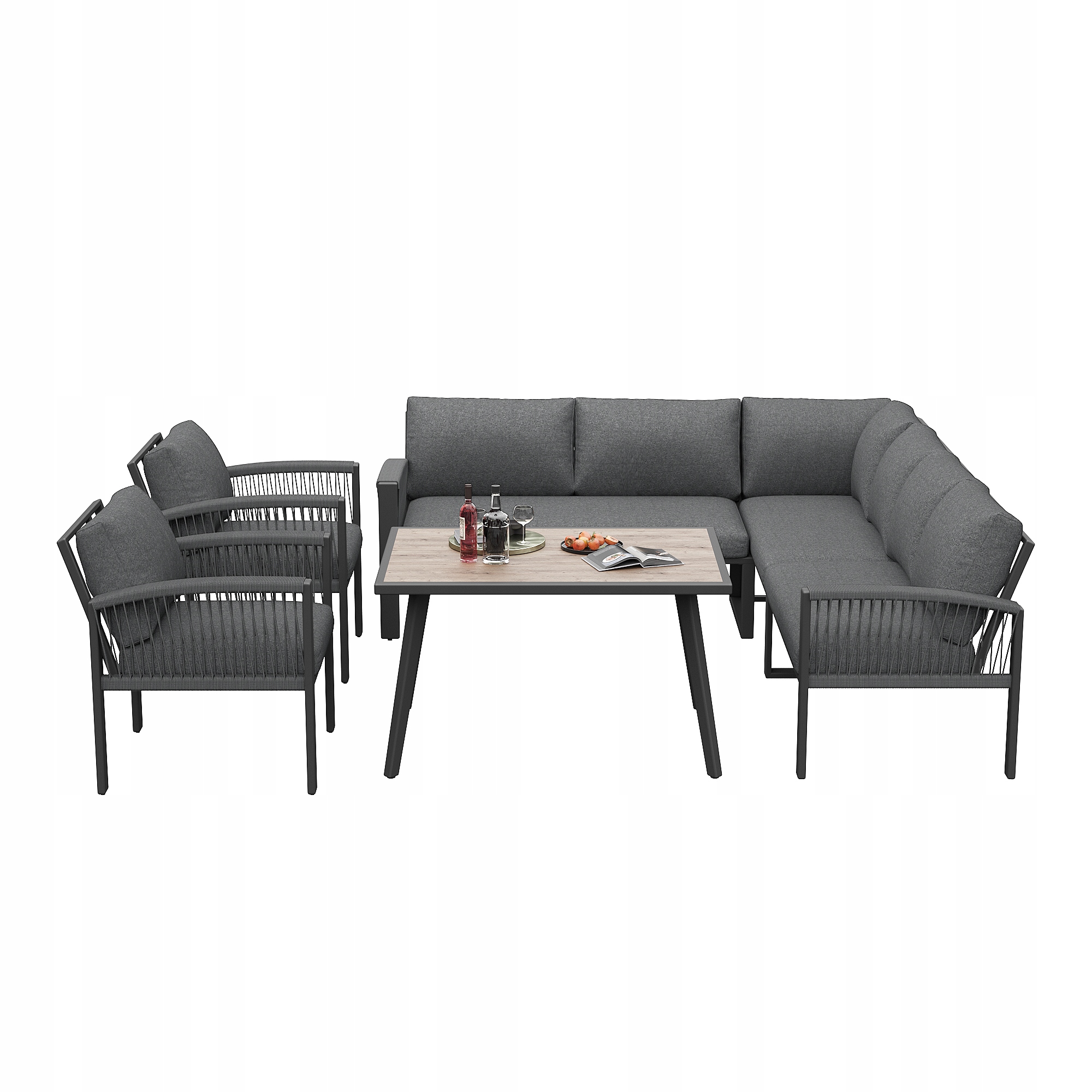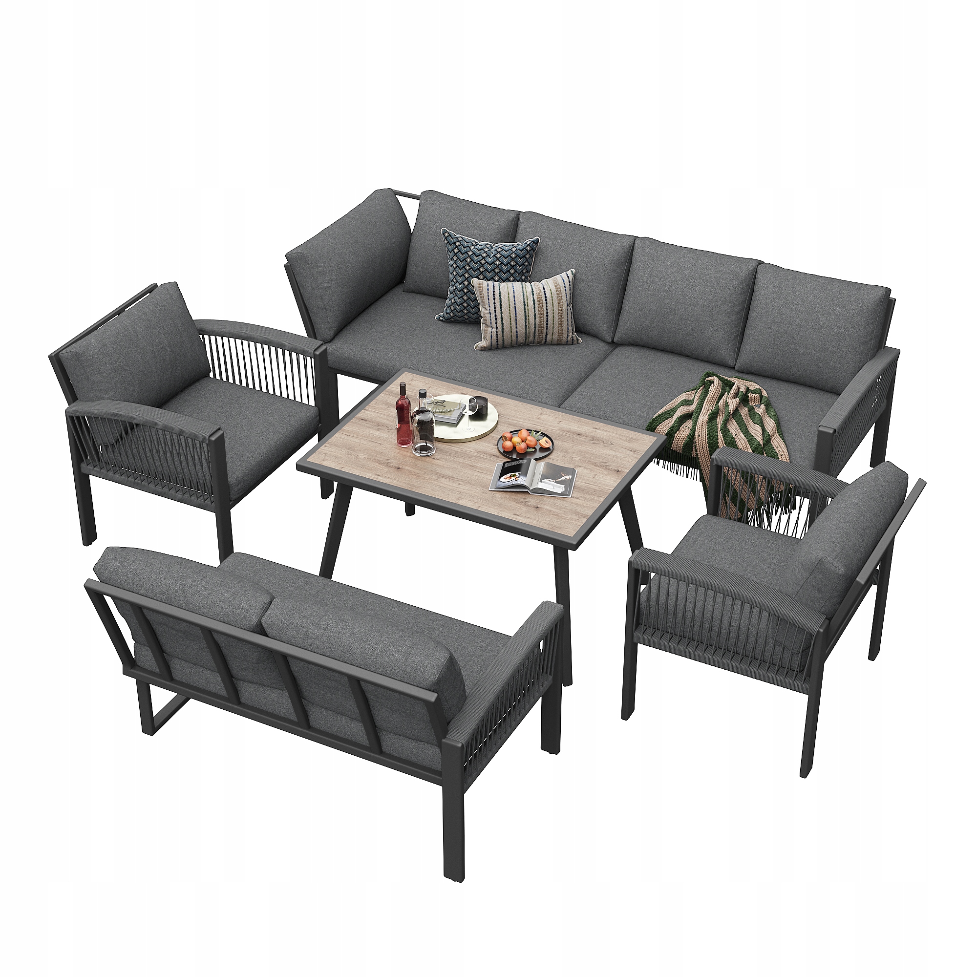 садовый набор, мебель, установленная для 8 человек, веревка, большой стол с деревянными зернами, с рамой из оцинкованного железа, регулируемых ножек, все подушки для сидений и поддержки в наборе, серый