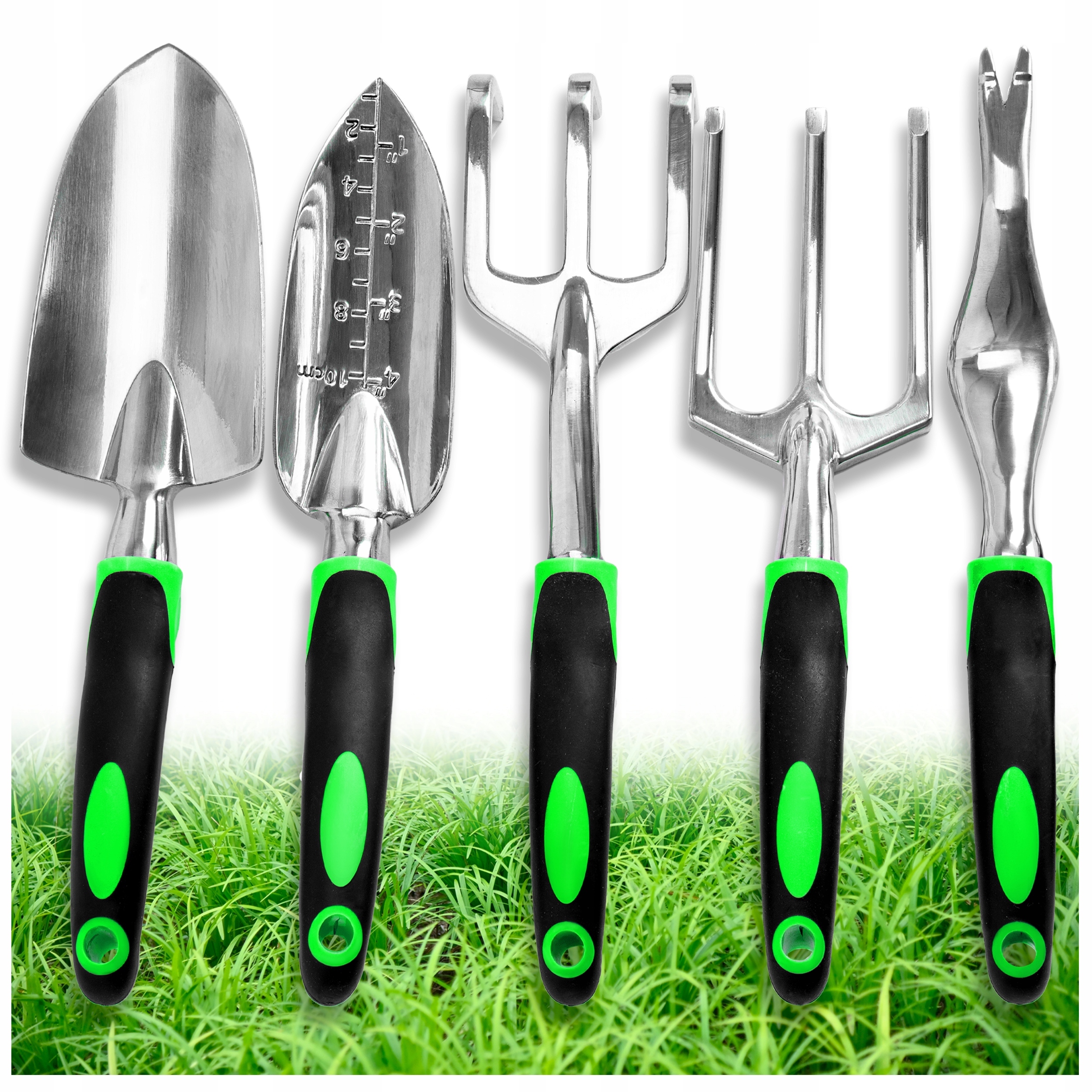 Полный набор из пяти садовых инструментов, прочный и долговечный, изготовленный из высококачественного алюминия, который справится с любыми задачами в саду. Эргономичные прорезиненные ручки обеспечивают удобный и надежный захват во время работы.