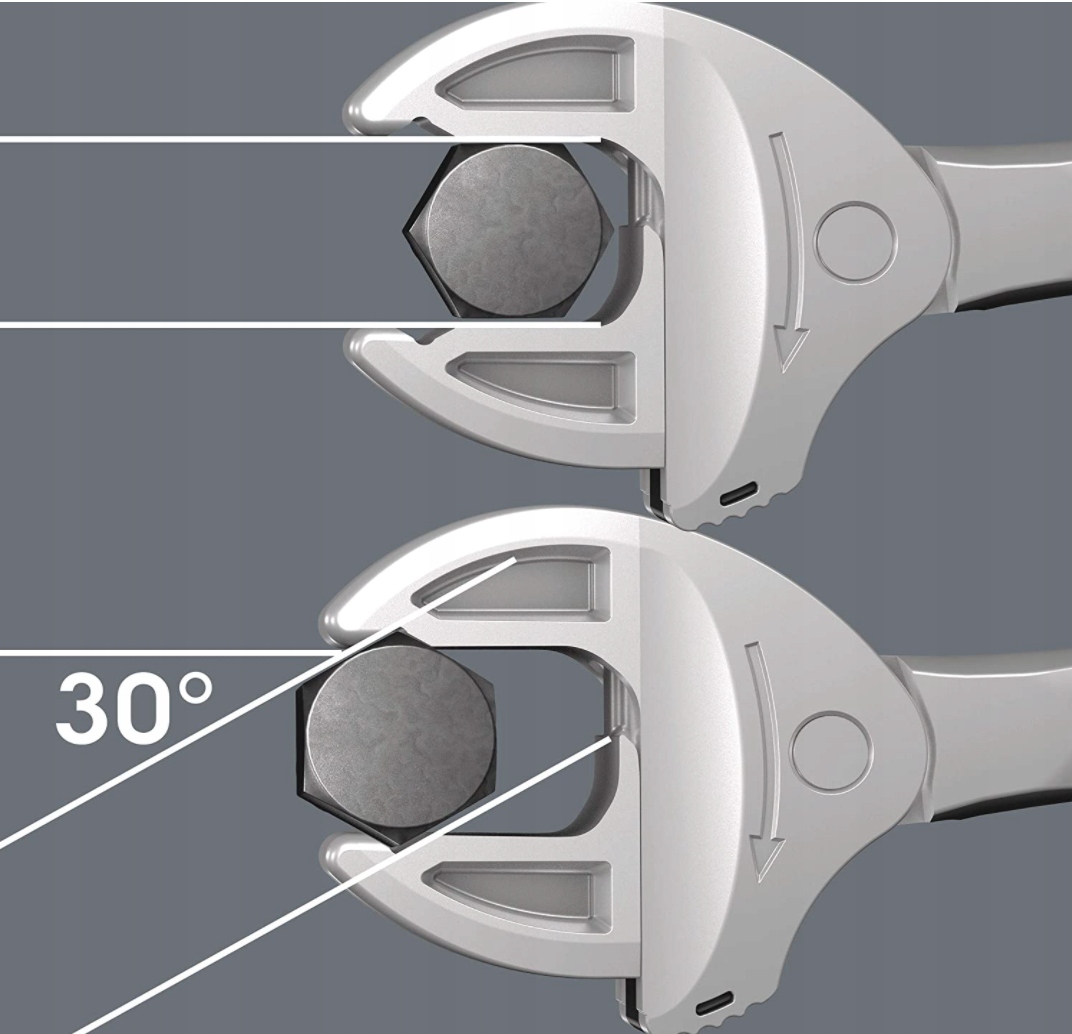 Бесступенчато регулируемые и параллельные кулачки заменяют плоские гаечные ключи нескольких отдельных размеров. . Саморегулировка до необходимого размера после закрепления инструмента на шестигранной гайке или винте. Встроенный рычажный механизм надежно зажимает шестигранный болт или гайку между губками, значительно снижая риск соскальзывания и повреждения. Храповый механизм обеспечивает быстрое и плавное завинчивание без перерывов.