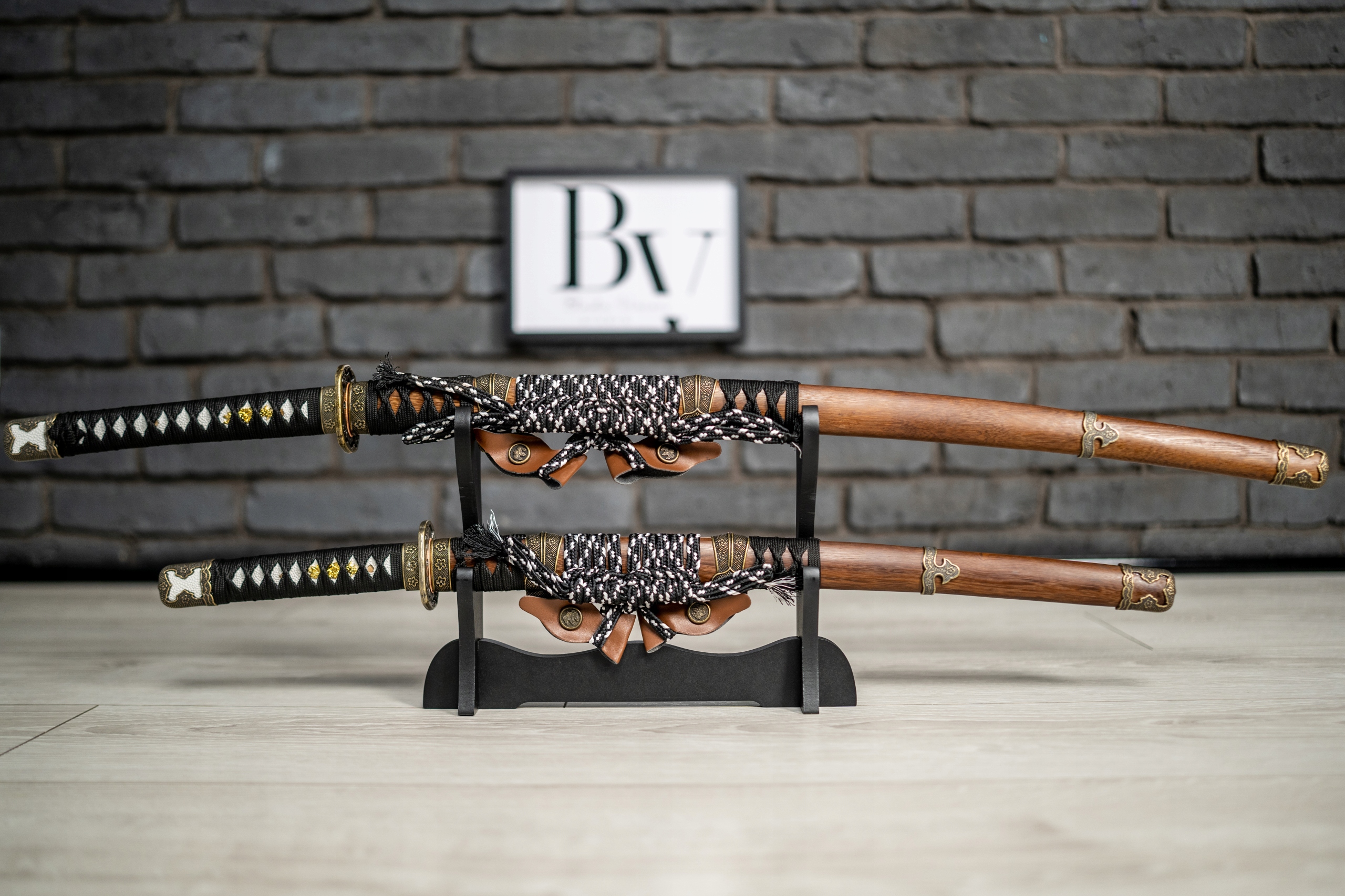 А главное, в комплект входят два одинаково изготовленных меча, чехол для каждого из них, двойная подставка и одинарная. Возможность конфигурировать и расставлять мечи на подставке дает настоящие впечатления.