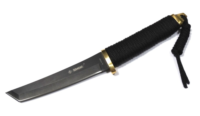 ТАНТО от КАНДАР. Укороченный тупой порог, что приводит к более длинной режущей кромке. Лезвие ножа с профилем TANTO имело плоский срез и было изготовлено из стали 440. Лезвие ножа покрыто черным напылением, которое устраняет блики и защищает нож от коррозии. Рукоять с нескользящей текстурой, украшенная латунными элементами, обеспечивает надежный хват, а крестовина защищает руку от соскальзывания на лезвие. На его конце имеется отверстие для продевания веревки. Полезен в любых условиях, также рекомендую любителям АЙКИДО.