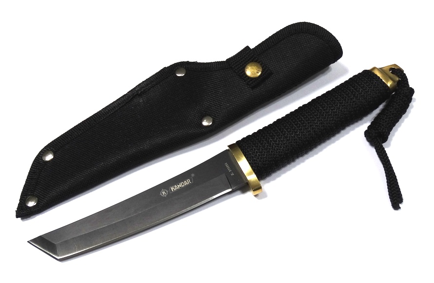 ТАНТО от КАНДАР. Укороченный тупой порог, что приводит к более длинной режущей кромке. Лезвие ножа с профилем TANTO имело плоский срез и было изготовлено из стали 440. Лезвие ножа покрыто черным напылением, которое устраняет блики и защищает нож от коррозии. Рукоять с нескользящей текстурой, украшенная латунными элементами, обеспечивает надежный хват, а крестовина защищает руку от соскальзывания на лезвие. На его конце имеется отверстие для продевания веревки. Полезен в любых условиях, также рекомендую любителям АЙКИДО.