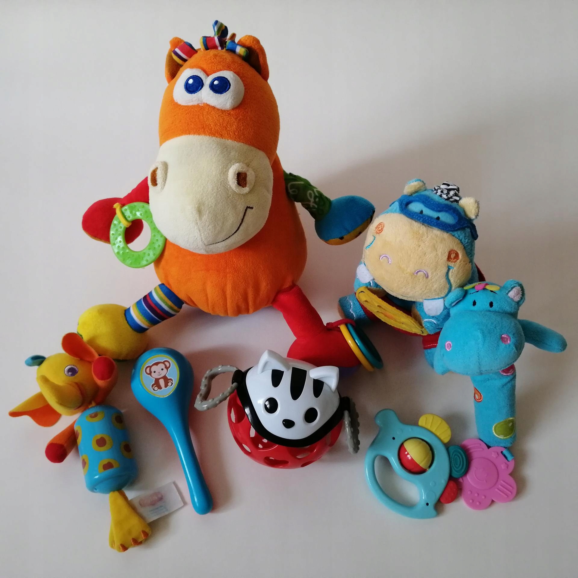 Набор сенсорных игрушек, гремучих, уверяющихся, чучел животных. Они издают разные звуки, имеют разные текстуры, материалы, цвета, предоставляющие ребенку различные тактильные, слуховые и визуальные стимуляции. Набор включает в себя 7 штук, представленных на изображениях игрушек: