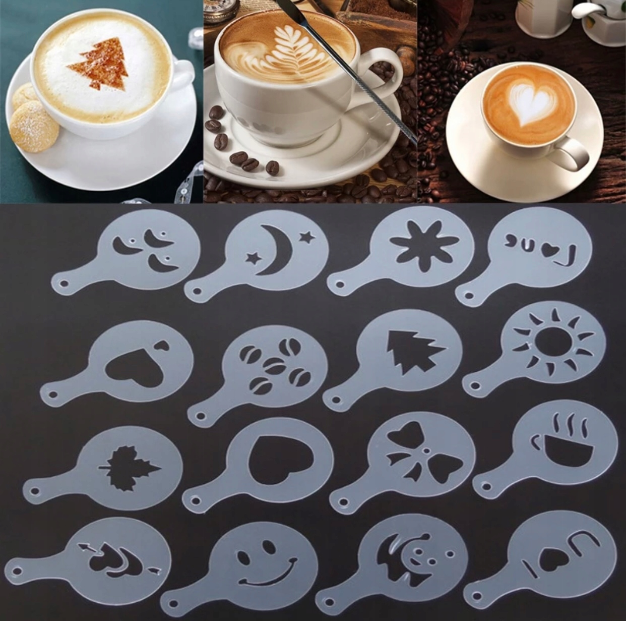 Подавайте кофе как профессиональный бариста с помощью наших шаблонов кофе и тортов. Они позволят вам быстро и легко украсить любимый кофе пенкой или торт шоколадной или какао-посыпкой. В набор входит целых 16 шаблонов для различных случаев, праздников и торжеств. После использования просто промойте их, и они прослужат долгие годы.