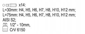 Профессиональный набор бит для откручивания специальных винтов с шестигранной головкой. Разнообразие бит позволяет выполнять множество работ в специализированных механических и автосервисах. Наконечники длиной 30 и 75 мм закреплены в шестигранном держателе 10 мм, приспособленном для работы с трещоткой 1/2". Набор изготовлен из легированной инструментальной стали S2 высочайшего качества, которая характеризуется: высокой твердостью HRC 58. -62, материал однородной, мелкозернистой структуры, устойчивость к кручению, высокий момент затяжки - 21,8 Нм, отличная закалка.