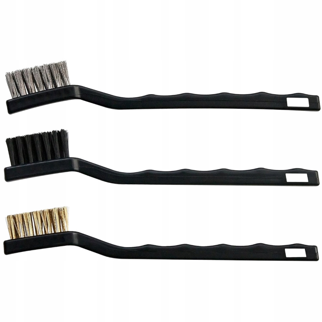 Проволочные щетки, набор из 3 кистей. Для очистки твердых поверхностей от ржавчины, краски, пыли и других легких загрязнений. Щетка профилирована для повышения эффективности очистки. Щетки из стали, нейлона и латунной проволоки. Отверстие в подвесной ручке позволяет повесить кисти.