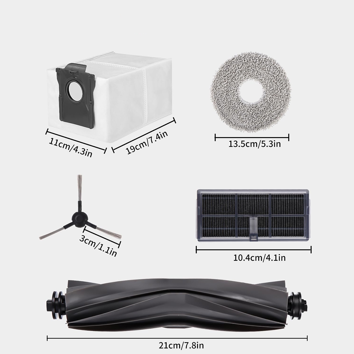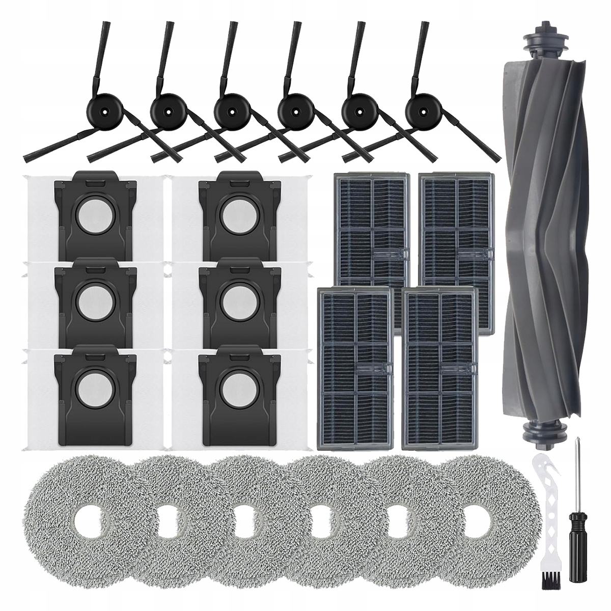 Набор C (25 штук): 1 основная щетка, 6 мешков для пыли, 6 салфеток, 4 фильтра, 6 боковых щеток, 1 чистящая щетка, 1 отвертка
