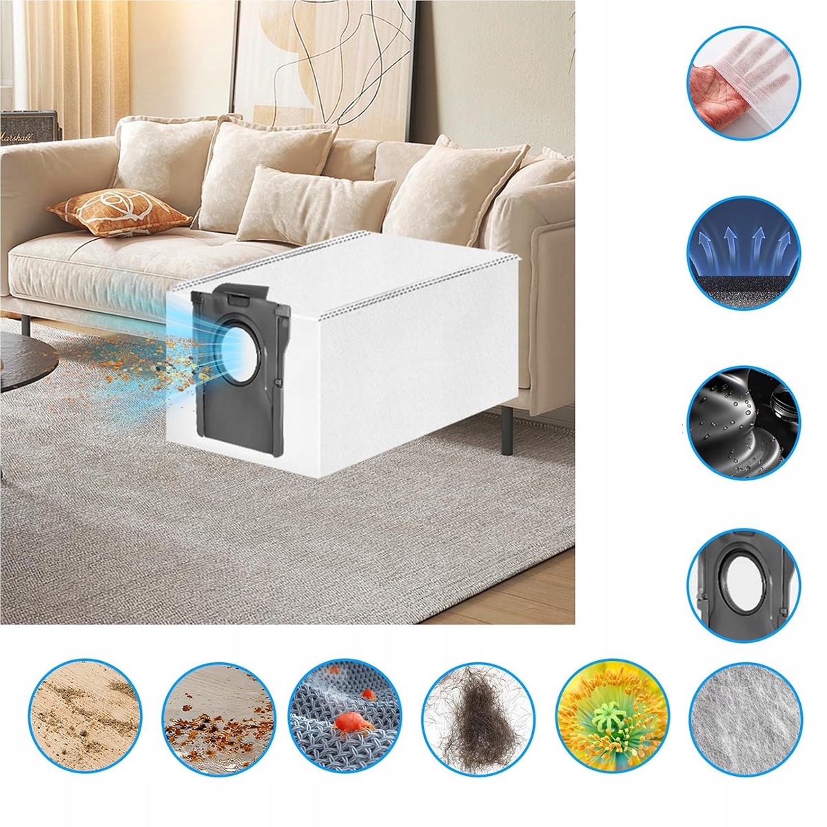 【Эффективная очистка】HEPA-фильтр удаляет 99% грязи, пыли, аллергенов и т. д. Просто промойте теплой водой и используйте повторно. Треугольные резиновые боковые щетки эффективно очищают углы и края. Пылесборник с фильтром из активированного угля предотвращает распространение запахов. Улучшенные салфетки из микрофибры обладают высокой впитывающей способностью, имеют уменьшенную толщину, что предотвращает зацепление робота и позволяет аккуратно чистить все твердые полы, не царапая их.