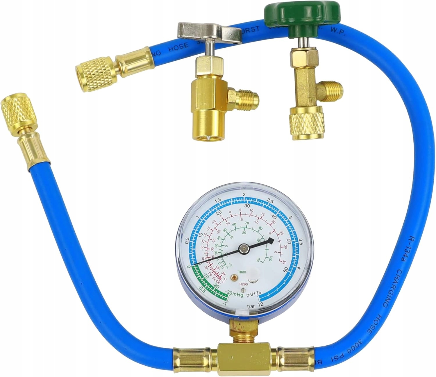 В комплект входит: 1 шт. Манометр R290 и R600a; 2 штуки баночных кранов; 2 шт. шлангов