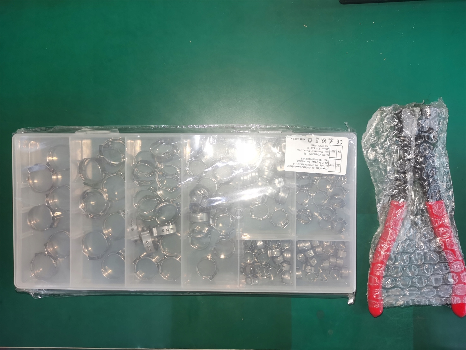 Набір шлангових хомутів з одним вушком, плоскогубцями та сталлю