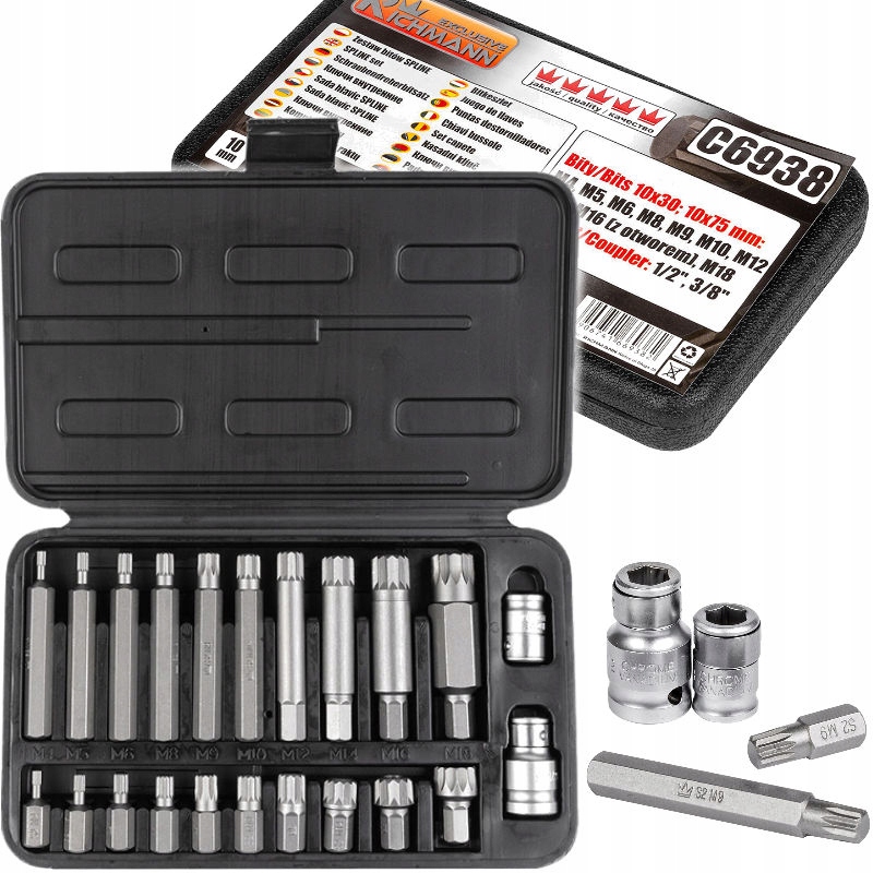 Набор C6938 от RICHMANN состоит из 22 различных бит с профилем SPLINE, которые предназначены для работы с торцовыми ключами размерами 3/8" и 1/2". Каждая бита имеет специальную форму, позволяющую точно и надежно затягивать заданные элементы.