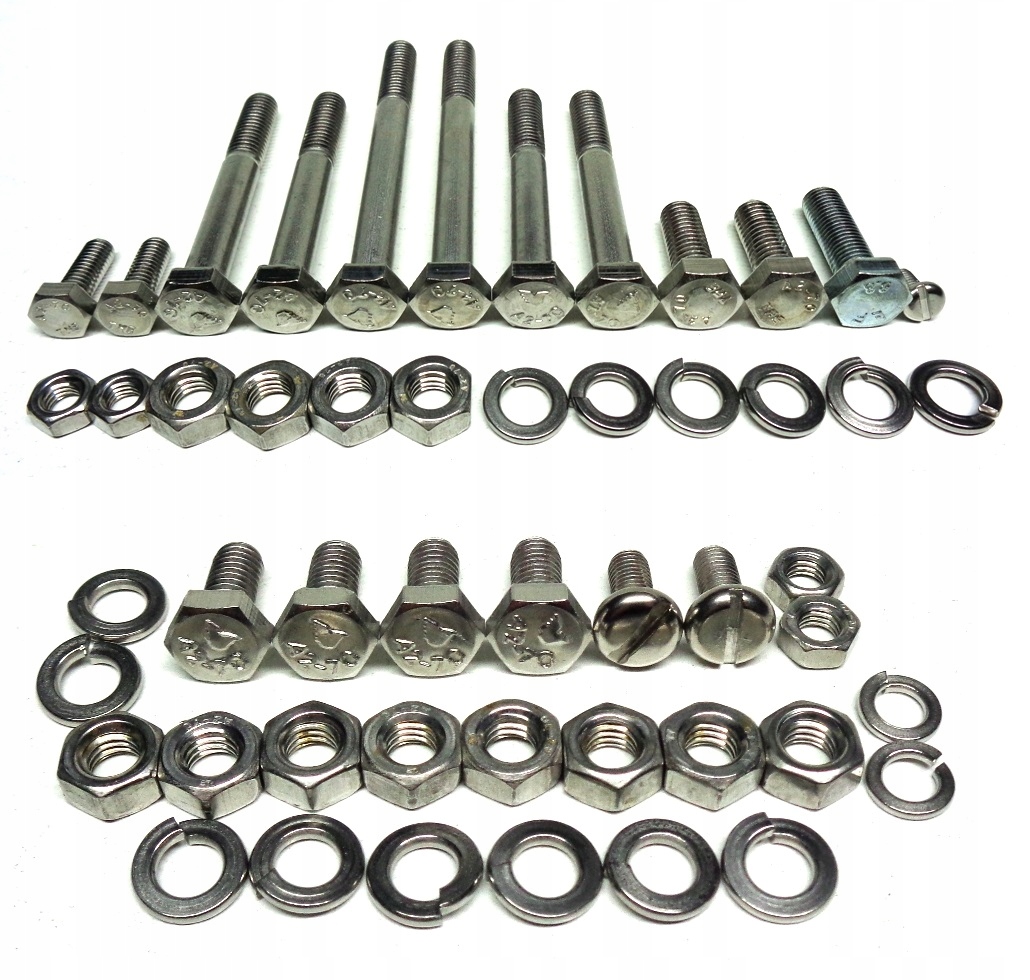 Комплект состоит из хромоникелевых элементов из нержавеющей стали, выполненных в классе А2. В комплект входят болты, винты, гайки и шайбы, разделенные на 17 отдельно упакованных групп, что позволяет без проблем собрать отдельные компоненты мотоцикла. В группу «Передняя подвеска» добавлен винт с резьбой М8х1 для прикручивания стойки переднего колеса. Шуруп оцинкован по классу 8,8.