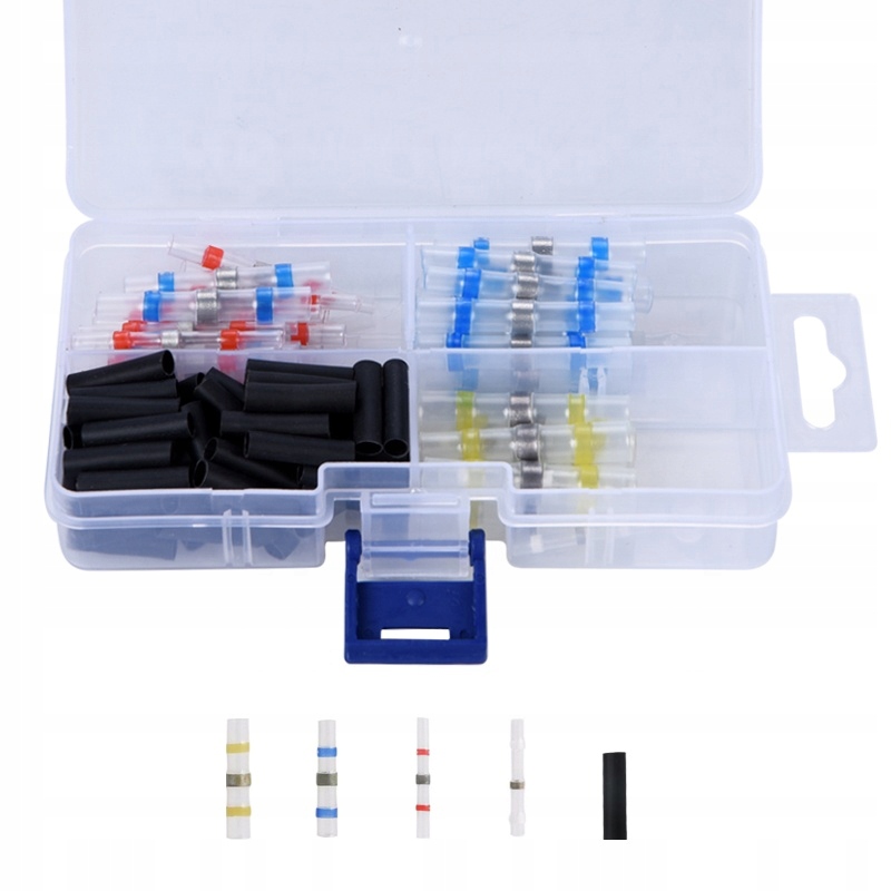 - Набор в удобной коробке из быстродействующих соединителей с жестью в термоусадочной трубке для ремонта и соединения кабелей.