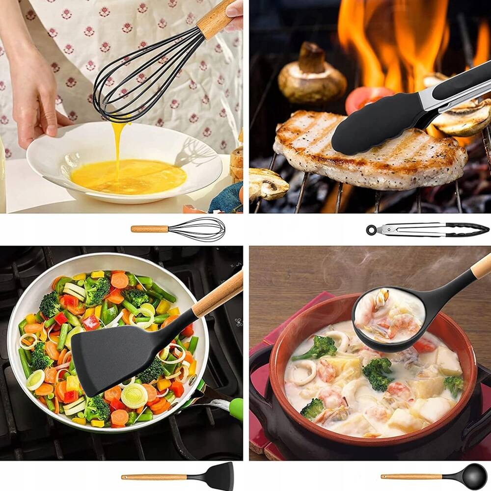 Силикон высочайшего качества: ручка из натуральной древесины долговечна и имеет отличную теплоизоляцию, чтобы предотвратить ожоги вашей руки. Все силиконовые детали устойчивы к температуре до 230 ° C, поэтому их можно безопасно использовать со всеми кухонными блюдами. Попрощайтесь с поцарапанными блюдами и наслаждайтесь приготовлением без каких -либо беспокойств. Неудача и устойчивые свойства создаются для уборки без проблем, набор кухонной посуды легко чистить, просто промойте ее под горячей водой или бросьте в посудомоечную машину