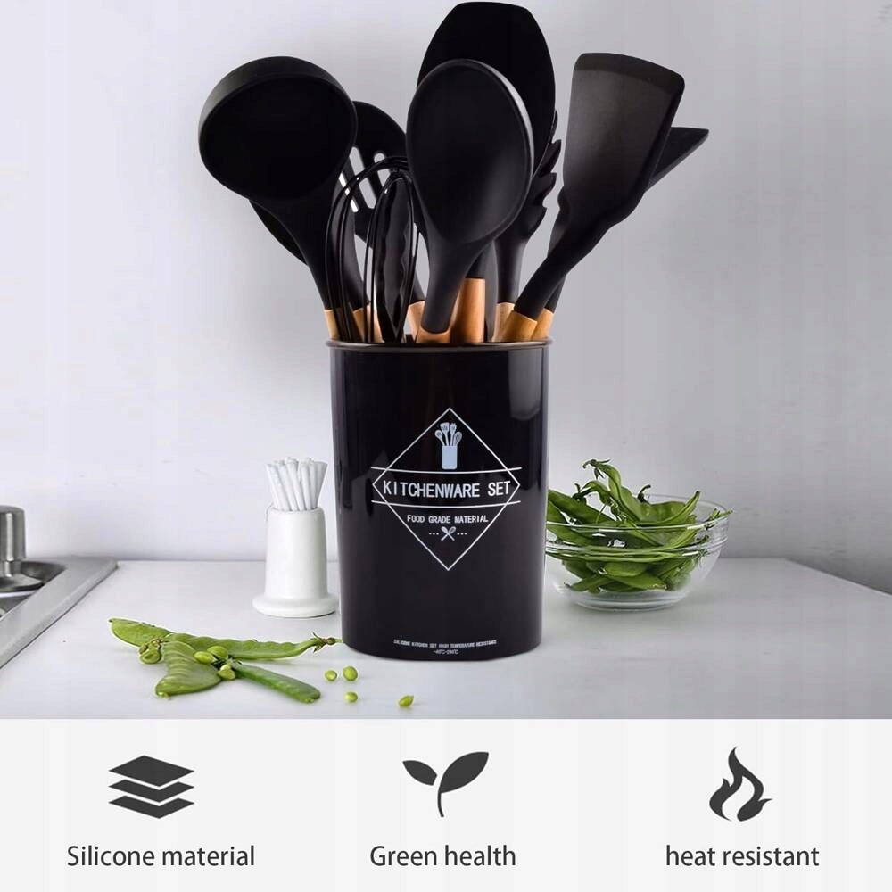 Набор из 12 силиконовой кухонной посуды: 12 Силиконовая кухонная утвари. Профессиональный набор силиконовой кухонной посуды содержит ложку для супа, скрещивания, шпателя, плоскогубца, котлета, ложки, ложки для макарон, кисти, лопасти, кнута и контейнера для аксессуаров, которые полностью удовлетворят ваши ежедневные потребности в приготовлении