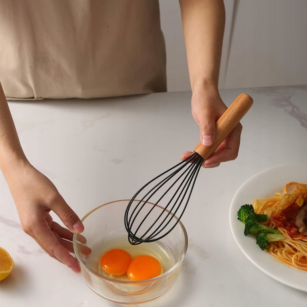 Сочетание силикона и дерева: Все гаджеты и кухонные инструменты представляют собой комбинацию силиконовой головки, предназначенной для контакта с едой и деревянной ручки. Силиконовая головка может защитить горшок, защитить поверхность от царапин или вмятины и продлить срок службы всех кухонных кастрюлей. Деревянная ручка эргономично спроектирована, которая очень удобна в использовании. Пыльный, но нелегкий деформированный