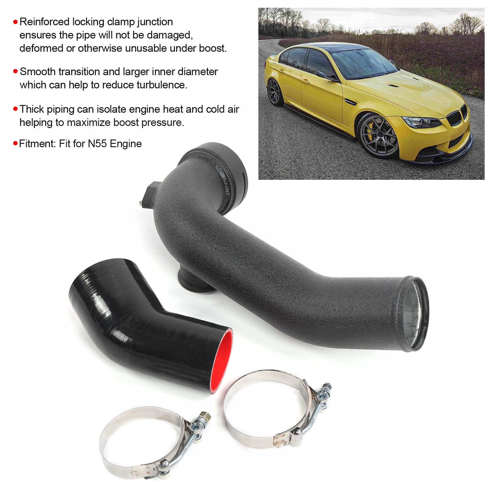 1. Оправочно-изогнутая конструкция, изготовлена из алюминиевого сплава, не прогибающегося под высоким давлением наддува. 2. Плавный переход и увеличенный внутренний диаметр помогают снизить турбулентность и обеспечивают надежность в использовании. 3. Усиленный зажимной соединитель гарантирует, что трубка не будет повреждена, деформирована или иным образом выйдет из строя при наддуве. 4. Толстые магистрали из алюминиевого сплава изолируют тепло двигателя от холодного воздуха, помогая максимизировать давление наддува. 5. Простая установка, нет необходимости постоянно модифицировать какие-либо соединительные детали, что делает установку двусторонней.