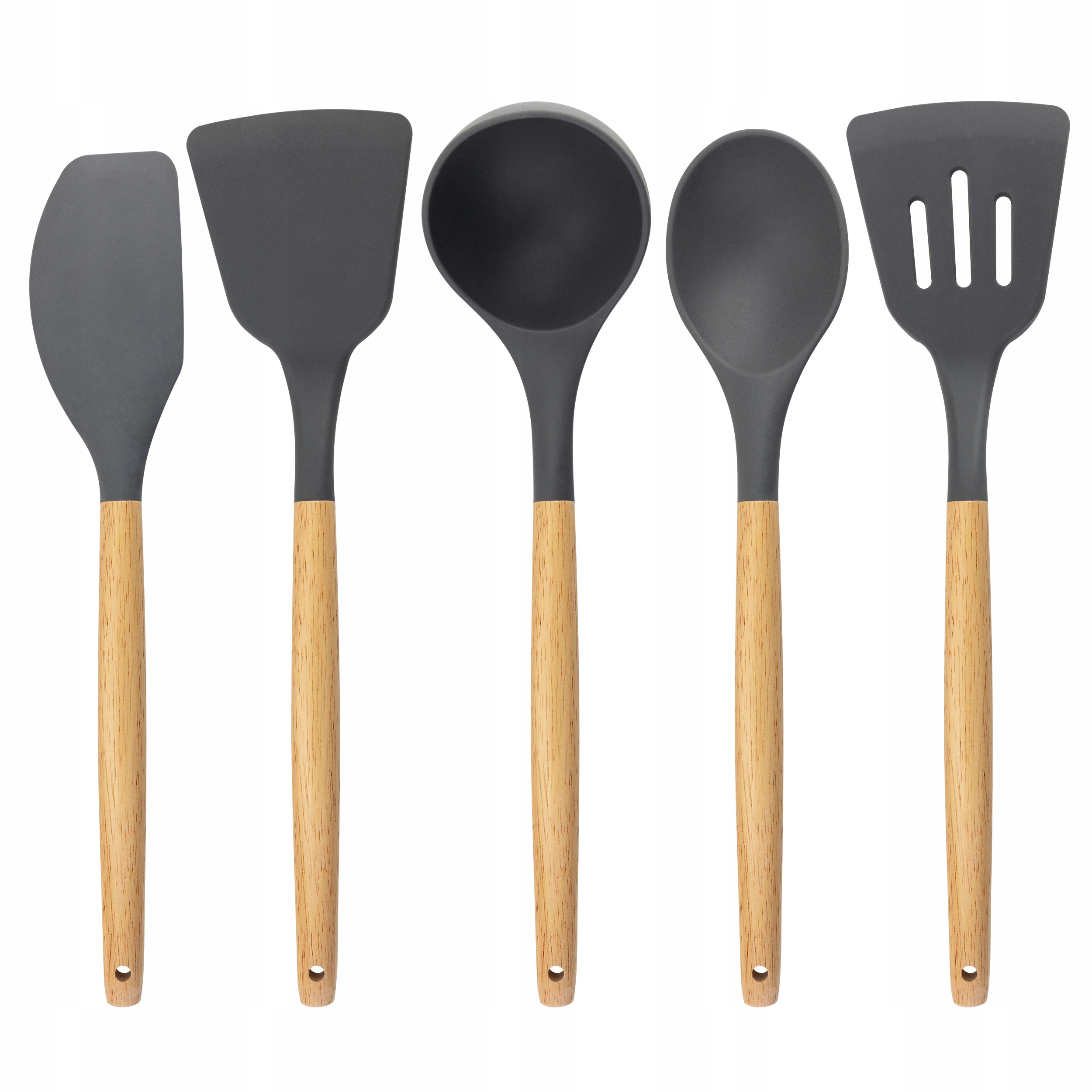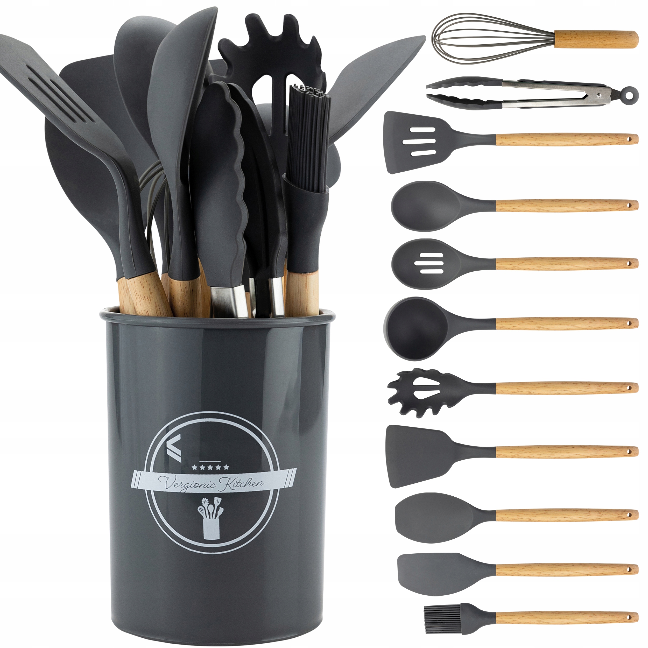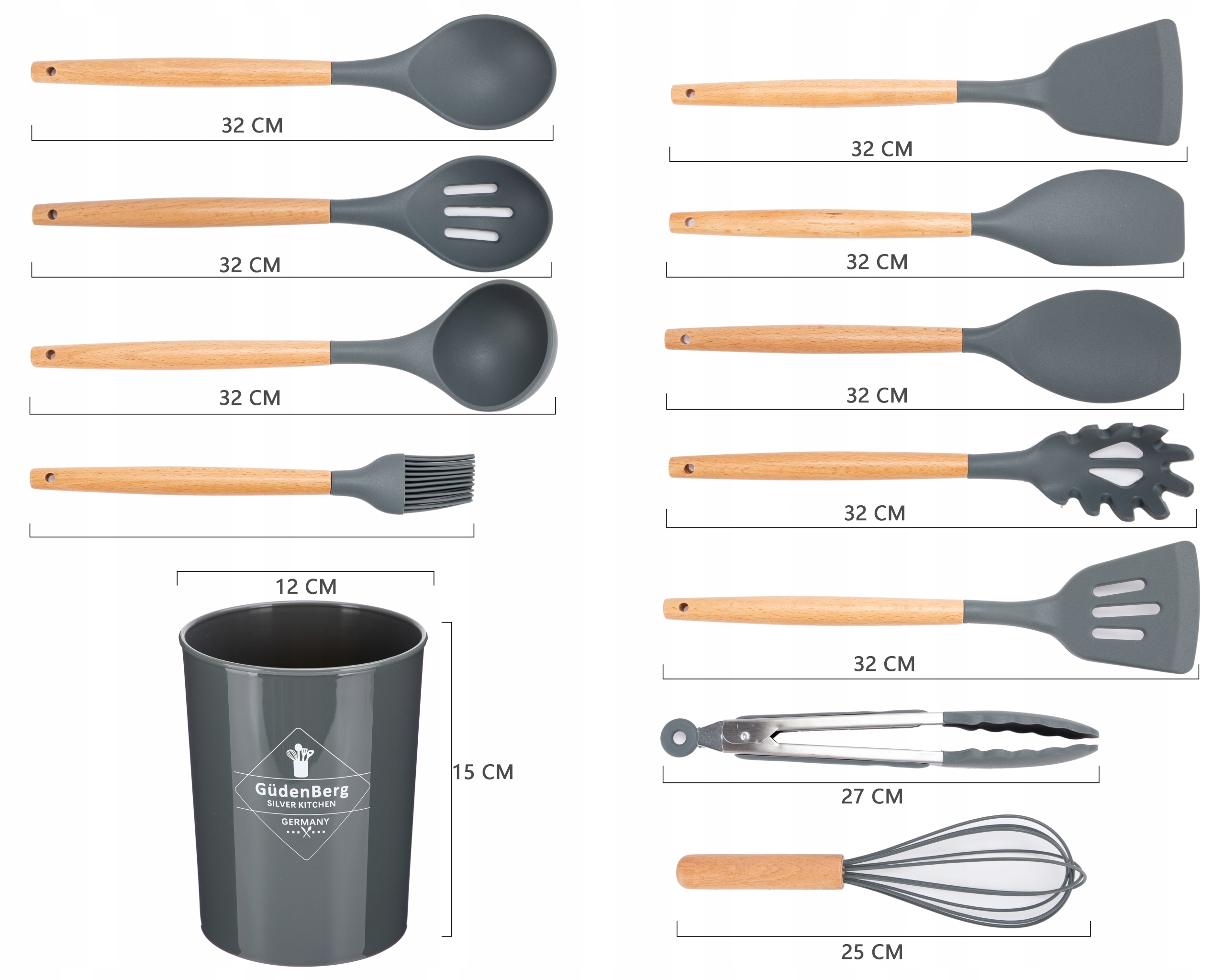 Важно облегчить вашу работу и в то же время минимизировать занимаемое ею пространство. Набор кухонной утвари – прекрасное решение при приготовлении еды. Посуда подходит для смешивания, процеживания, нанесения и переворачивания различных ингредиентов. В набор входят 12 элементов, которые сделают приготовление пищи более приятным и эффективным, в том числе: кисточка, ложки, лопаточки, ситечки, венчик, щипцы и контейнер для хранения. Каждый элемент имеет отверстие, позволяющее подвешивать его отдельно. Кроме того, благодаря контейнеру набор можно разместить в одном месте на кухне. Все элементы изготовлены из качественного дерева и силикона, что обеспечивает не только долговечность, но и простоту чистки. Они не повреждают поверхность посуды. Кроме того, эргономичная форма ручек гарантирует удобный и надежный хват, что позволяет выполнять точную и безопасную работу. *Не рекомендуется оставлять посуду на горячей посуде и использовать ее при слишком высоких температурах выше 200°С.
