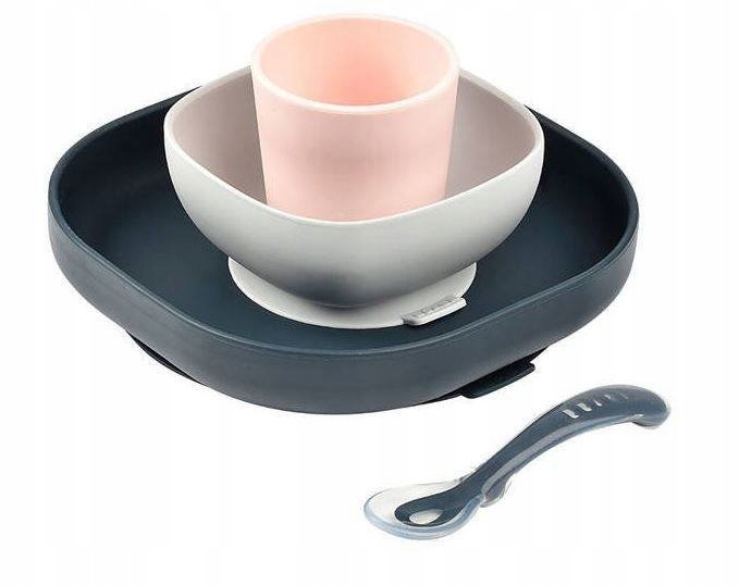 В комплект силиконовой посуды входит:большая тарелка, вместительная миска, удобная чашка и ложка > профилирован, чтобы ребенку было легче захватывать его. Бока тарелки завернуты, благодаря чему малышу легче черпать еду ложкой или вилкой. И миска, и тарелка оснащены присоской, благодаря которой они устойчиво стоят и не двигаются.