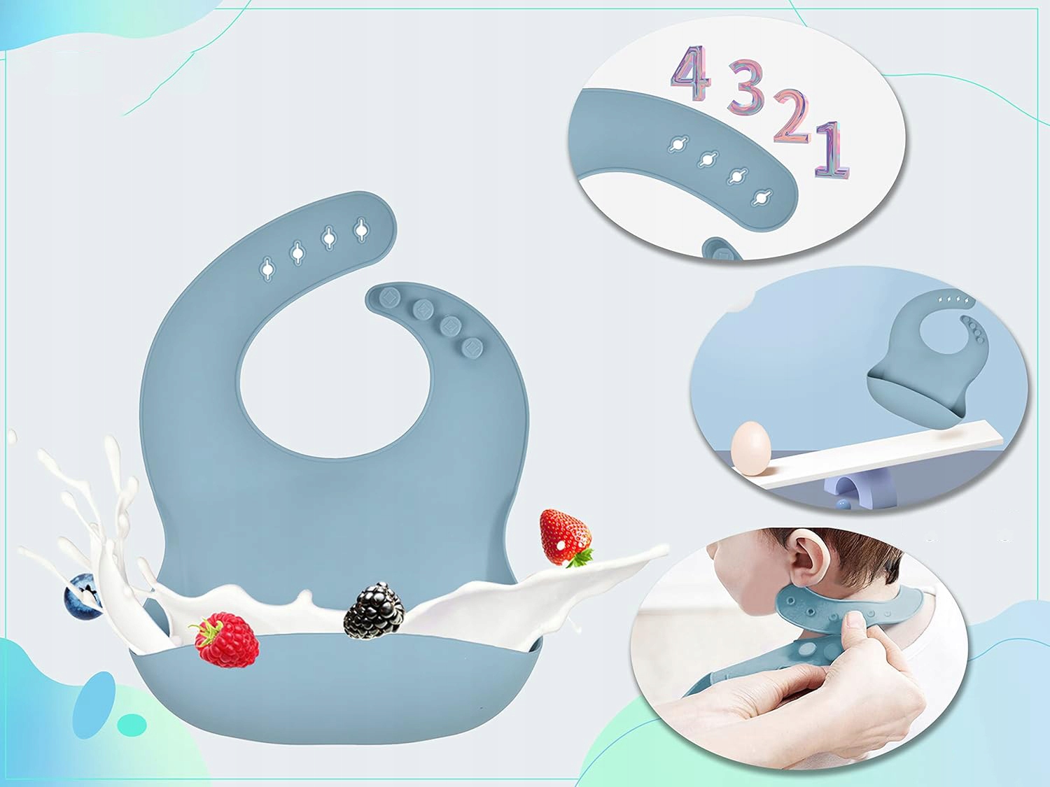 - 👶 Силиконовый нагрудник с регулируемыми кнопками и большим поддоном для сбора капель улавливает еду, выпадающую изо рта ребенка, и предотвращает ее падение на пол и одежду.