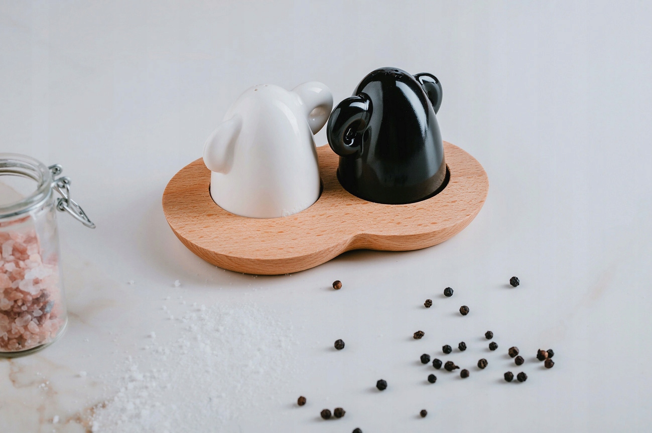 Набор стильных вращения для соли и перца из пластика. Целое было размещено на деревянной основе.