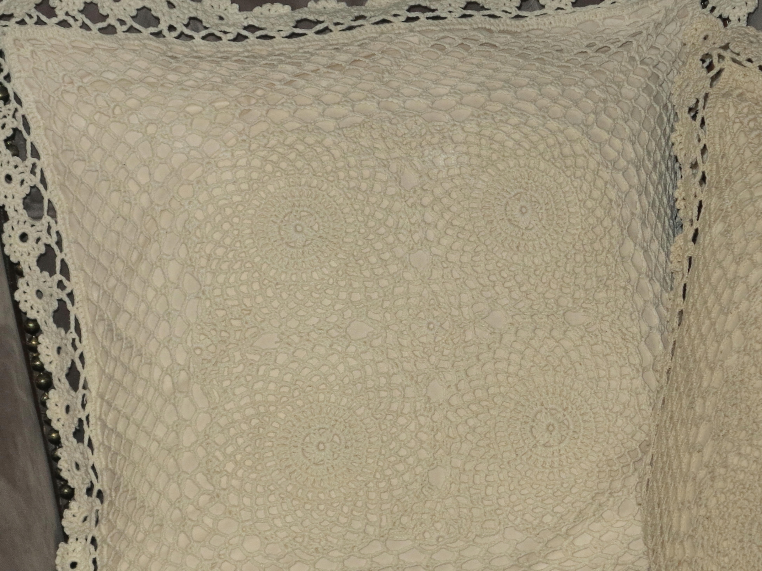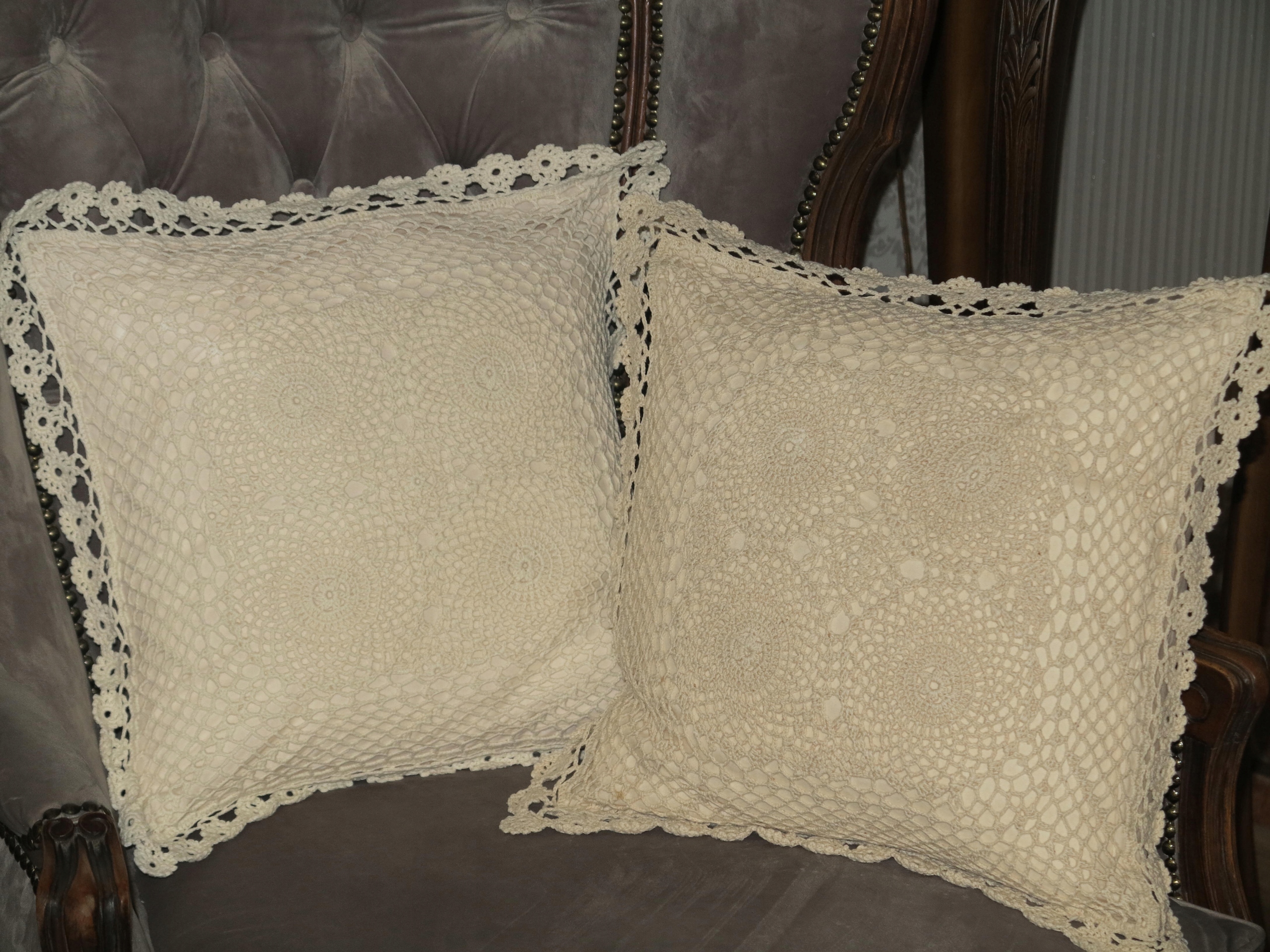 НАБОР ПРЕКРАСНЫХ ПОДУШЕК ВЯЗАННЫХ КРЮЧКОМ С МЯГКИМ, ОЧЕНЬ ПУШИСТЫМ НАПОЛНИТЕЛЕМ. ОДНА ПОДУШКА СВЕТЛОГО ЭКРЮ, ДРУГАЯ ПО МОЩНЕЕ БЕЛОГО КРЮКА - ТАКОЙ УЗОР