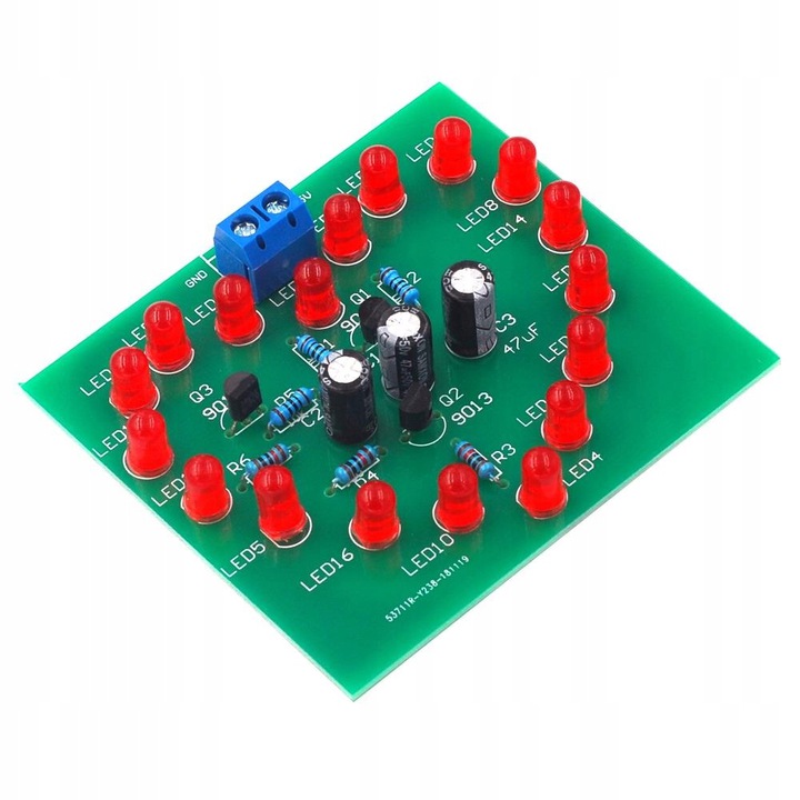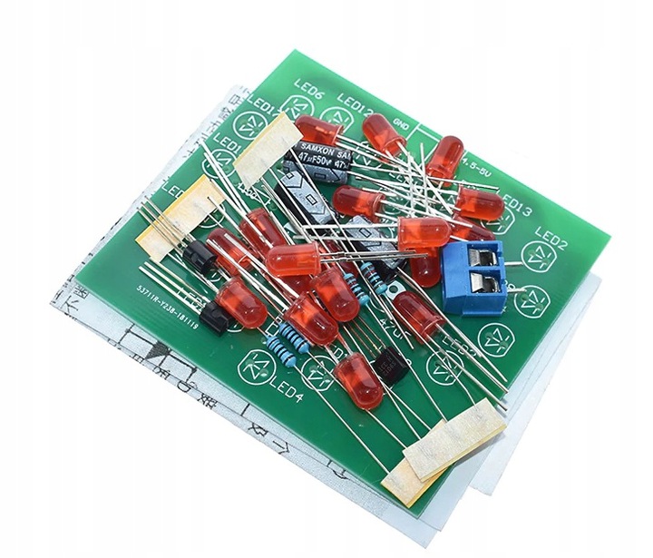 Системы имеют печатную схему сборки на пластине. Вы должны обратить внимание на полярность для таких элементов, как конденсаторы, диоды, транзисторы. В случае светодиодов более длинная нога составляет плюс +, большинство элементов описали параметры на корпусе. Резисторы могут иметь маркировку полоса, их сопротивление и толерантность могут быть прочитаны с использованием калькуляторов, доступных в Интернете, или путем измерения метра. Порядок сборки обычно является произвольным, в зависимости от системы, мы сначала устанавливаем наименьшие элементы. 1> Скачать Ссылка: