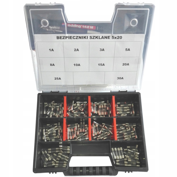 Набор из 200 стеклянных предохранителей диаметром 20 мм в органайзере, черный пластиковый корпус с защелкой и прозрачной верхней крышкой. Предохранители номиналом от 1А до 30А