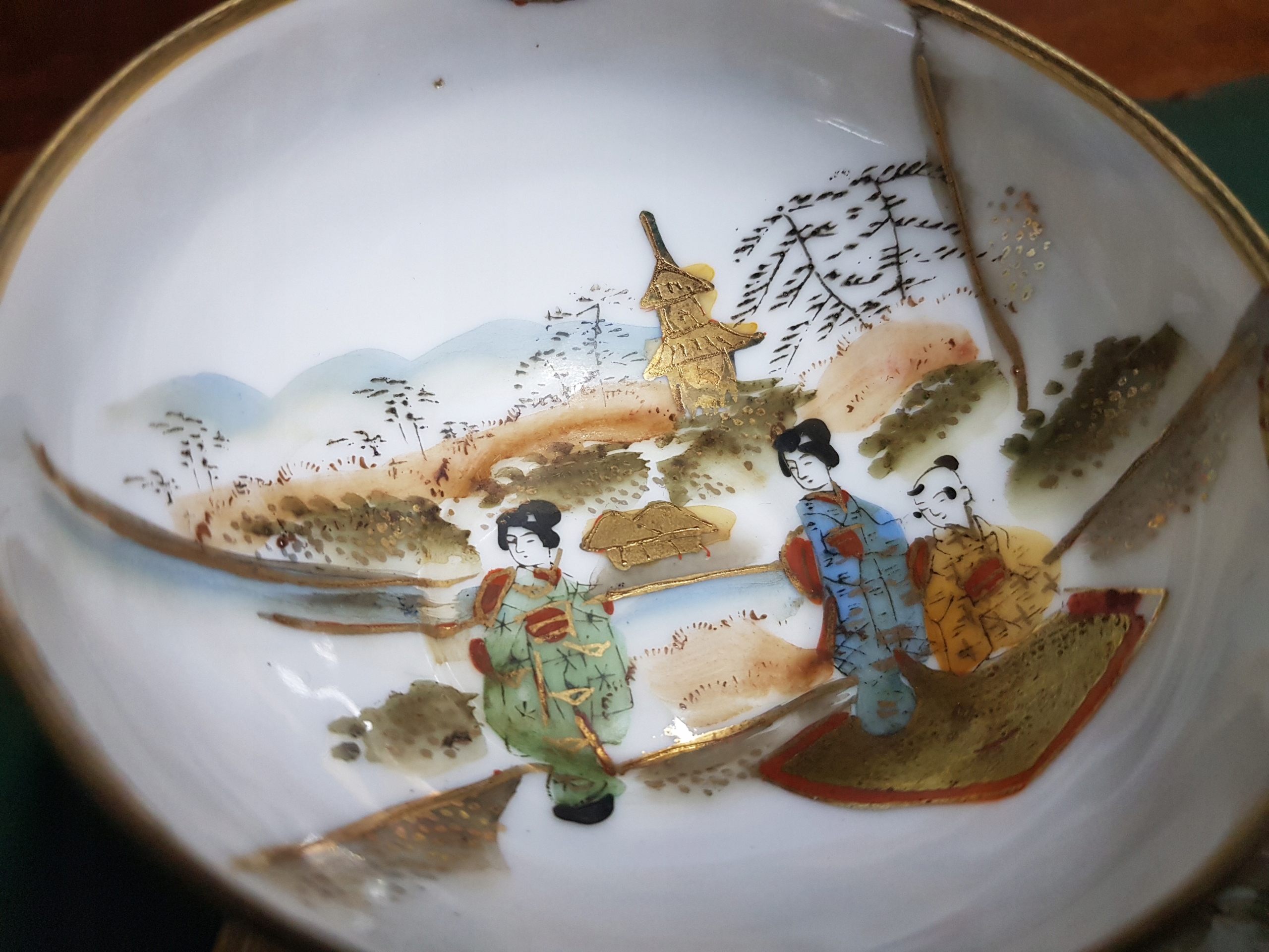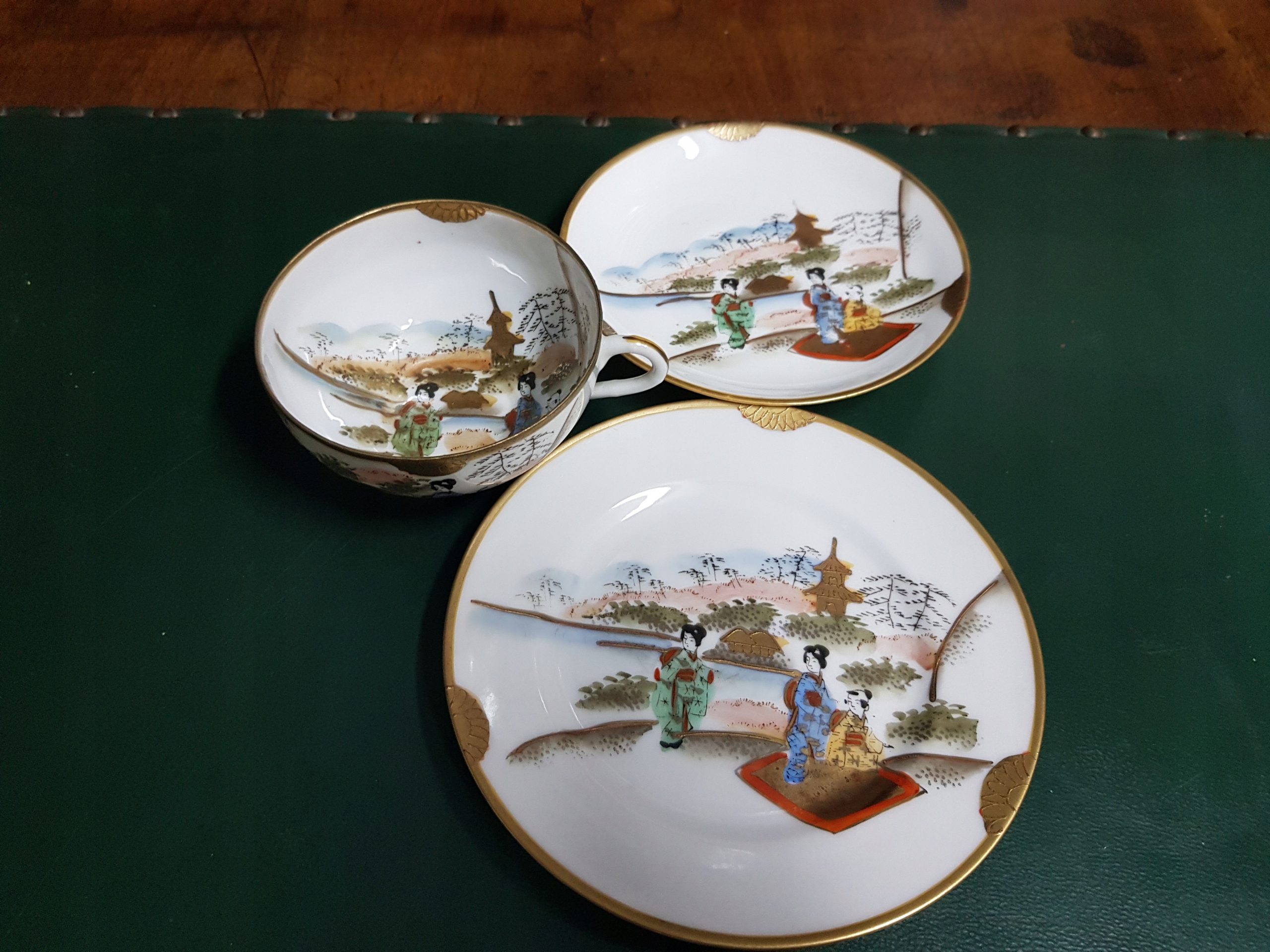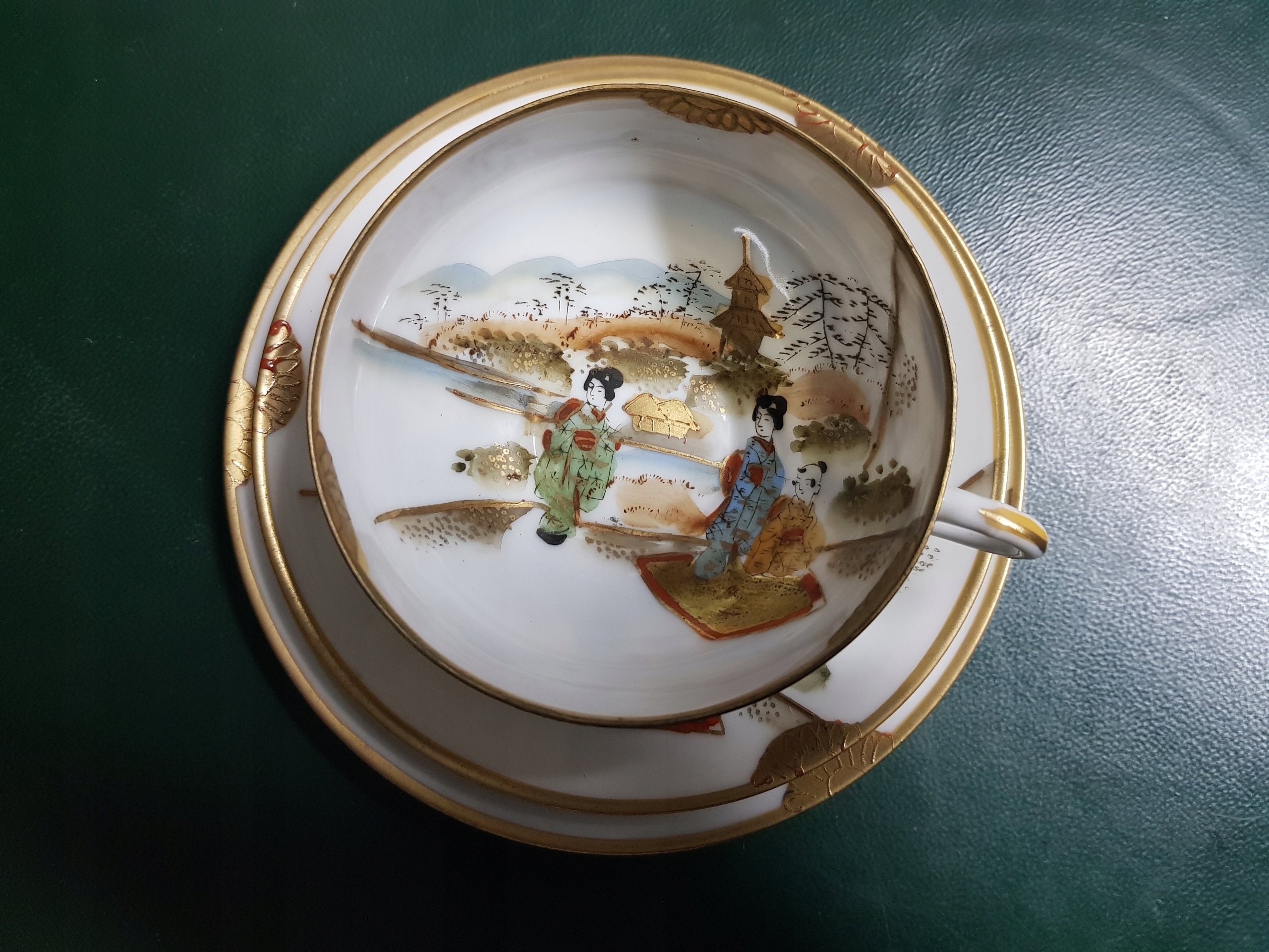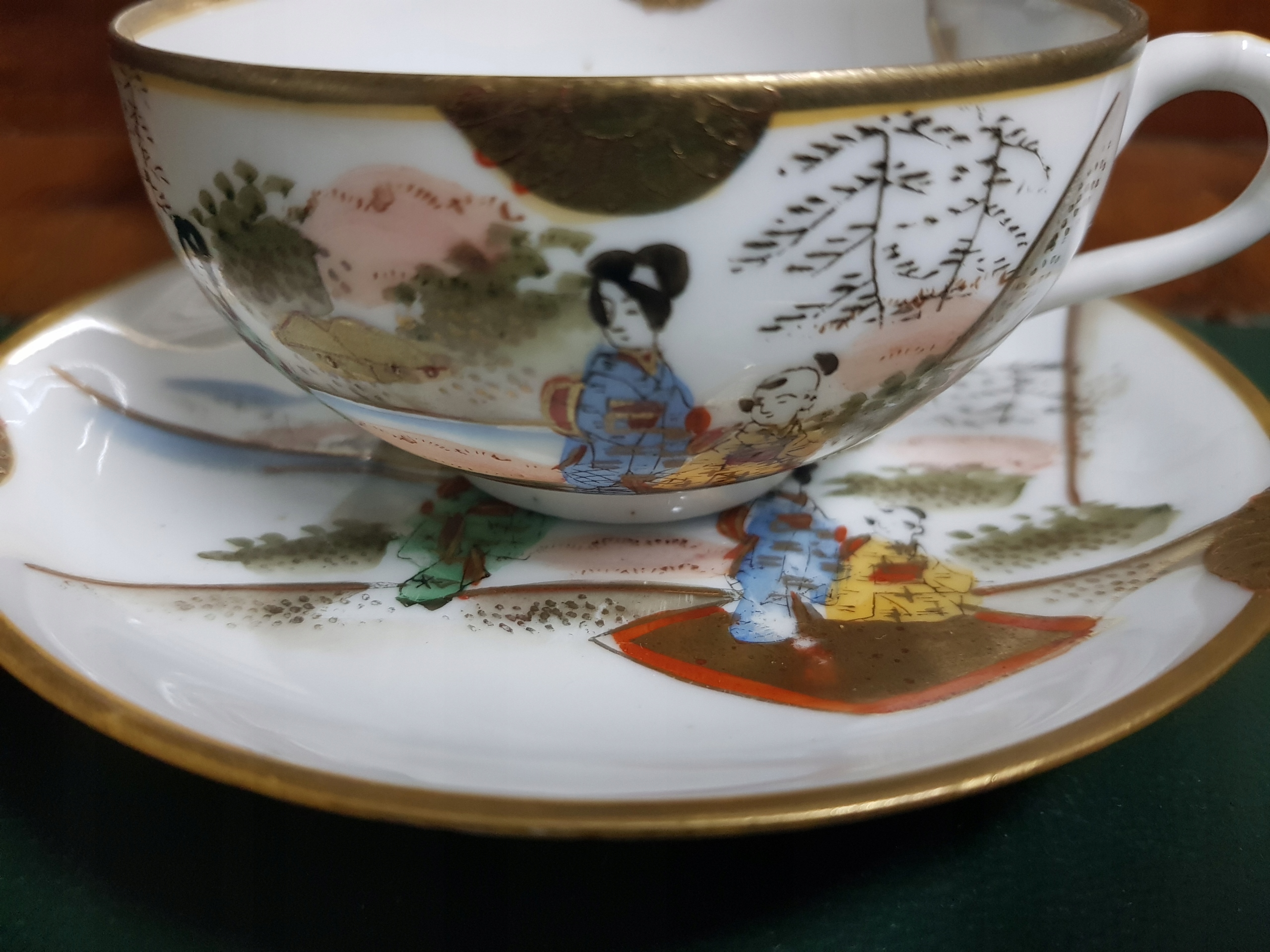 Предмет аукциона — декоративный набор с ручной росписью гейш Японии. Чашки внутри расписаны вручную. Позолота ок.